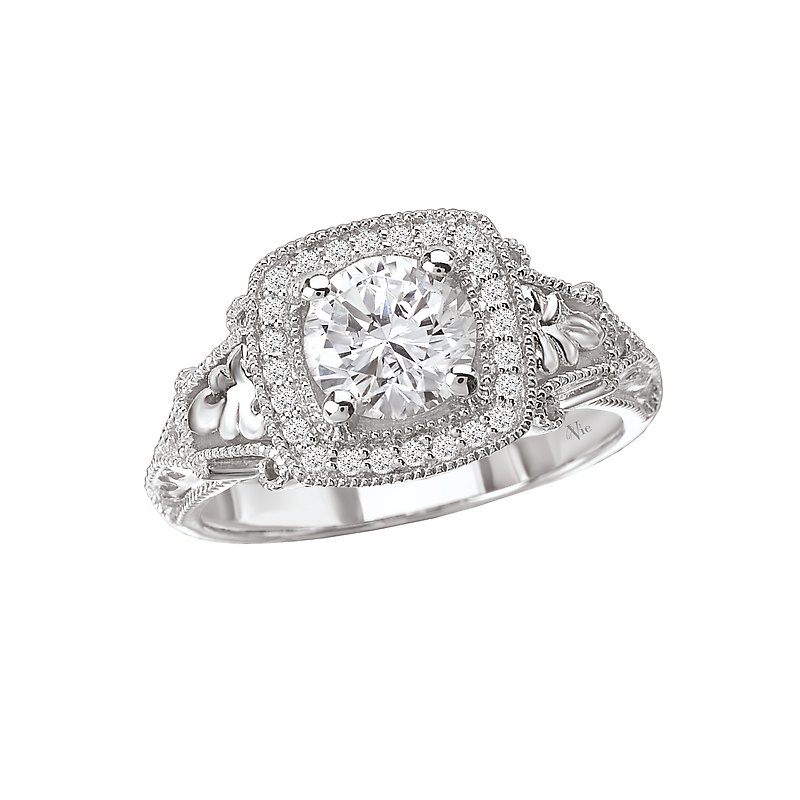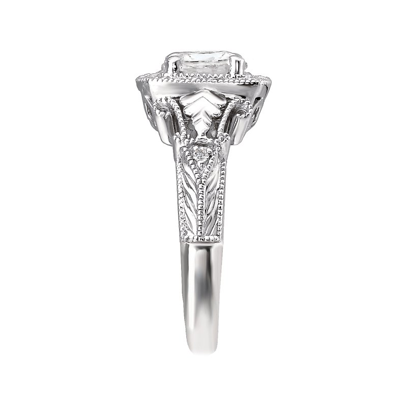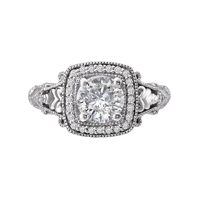 Square Halo Diamond Ring in 14kt White Gold with Milgrain Detail (D.1/7 carat total weight) This item is a SEMI-MOUNT and it comes with NO CENTER STONE as shown but it will accommodate a 6.5mm round center stone.