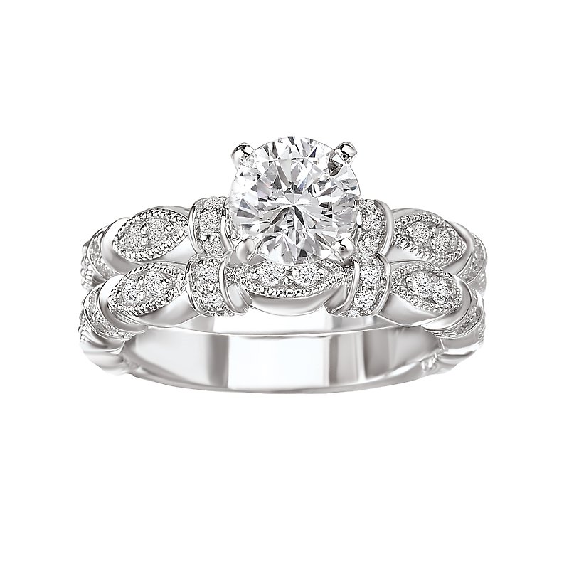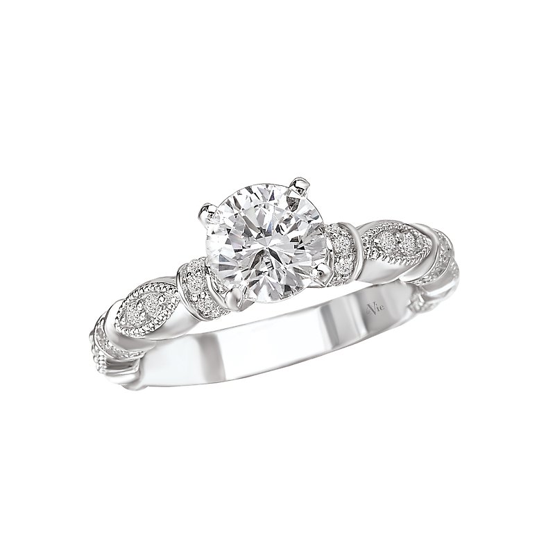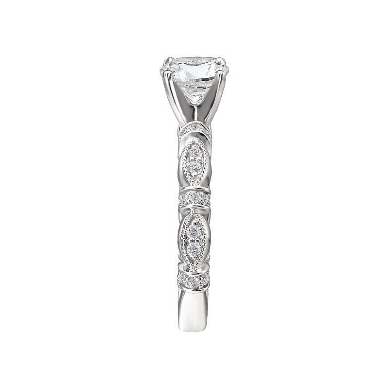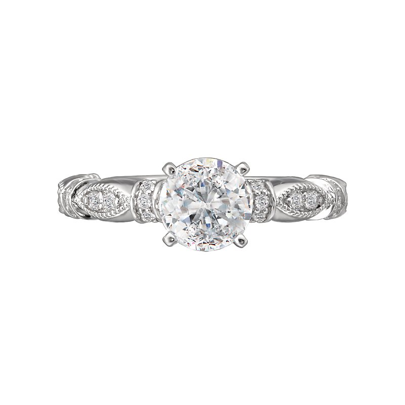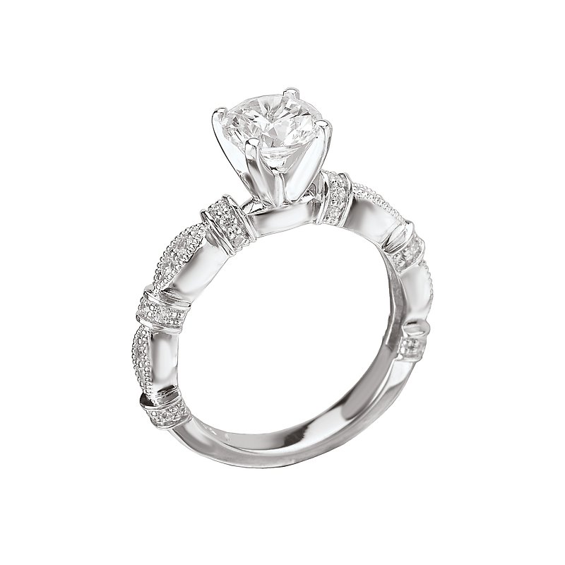 Diamond Engagement Ring in 14kt White Gold with Bead Detail. (D.1/4 carat total weight) This item is a SEMI-MOUNT and it comes with NO CENTER STONE as shown but it will accommodate a 6.5mm round center stone. Peg Head