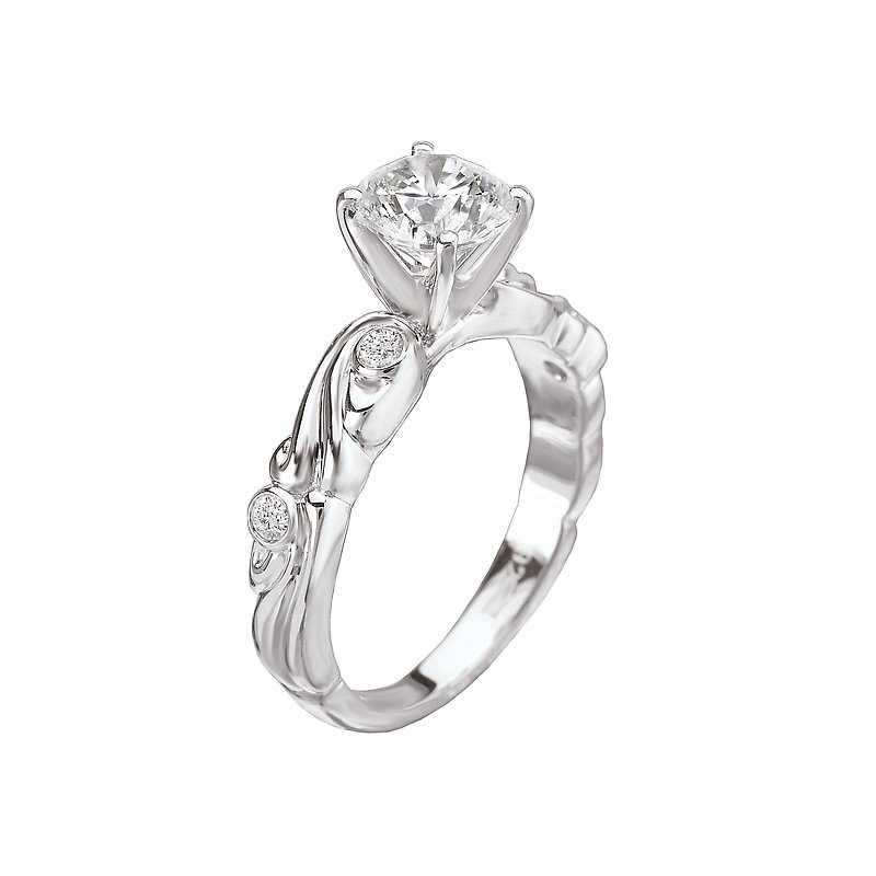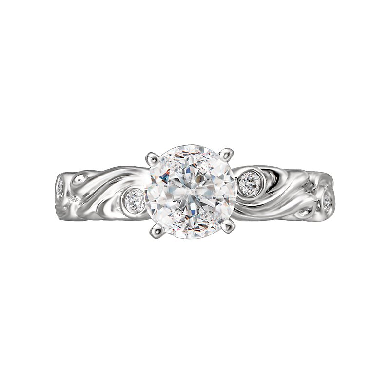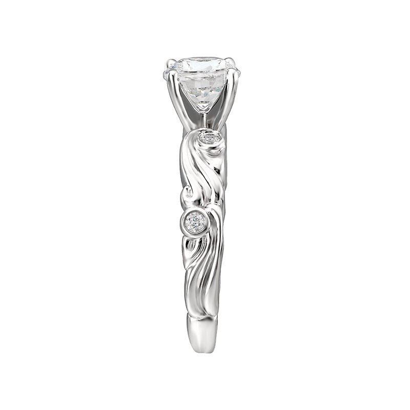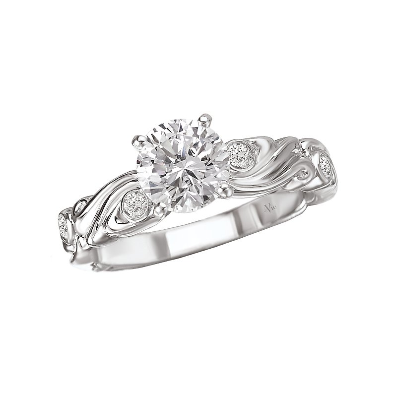 Swirl Designed Diamond Engagement Ring in 14kt White Gold. (D.08 carat total weight) This item is a SEMI-MOUNT and it comes with NO CENTER STONE as shown but it will accommodate a 6.5mm round center stone. Peg Head
