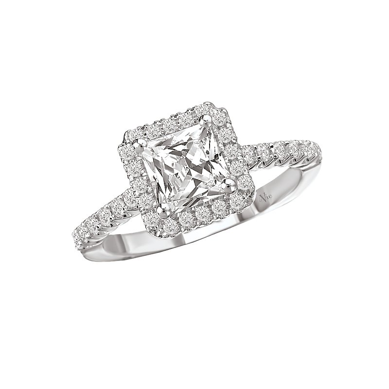 A square halo of sparkling diamonds is showcased on this elegant engagement ring crafted in 14kt White Gold. (D 1/3 carat total weight) This item is a SEMI-MOUNT and it comes with NO CENTER STONE as shown but it will accommodate a 5.5mm princess cut center stone.