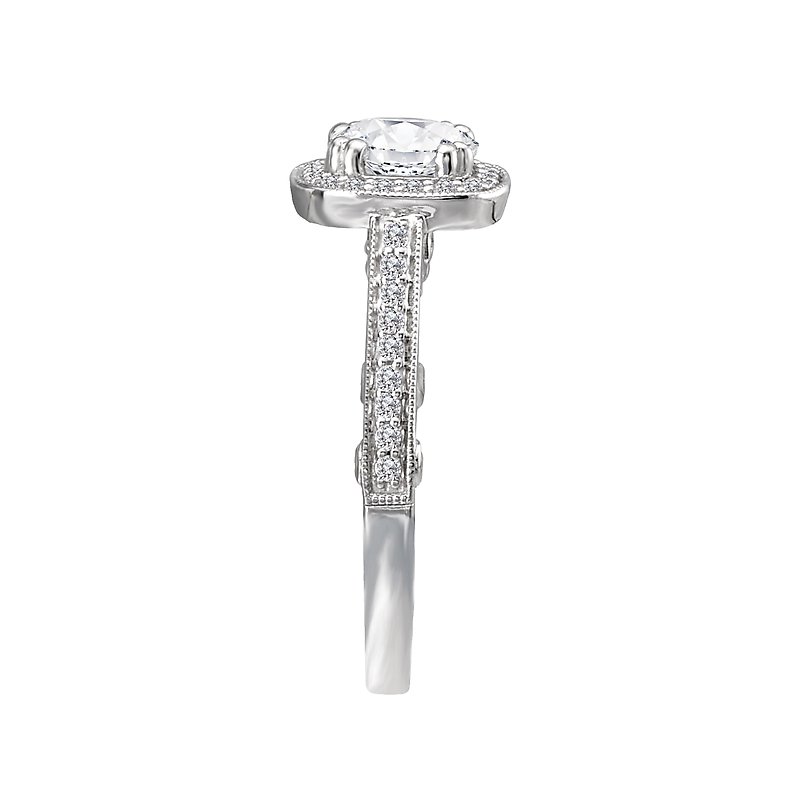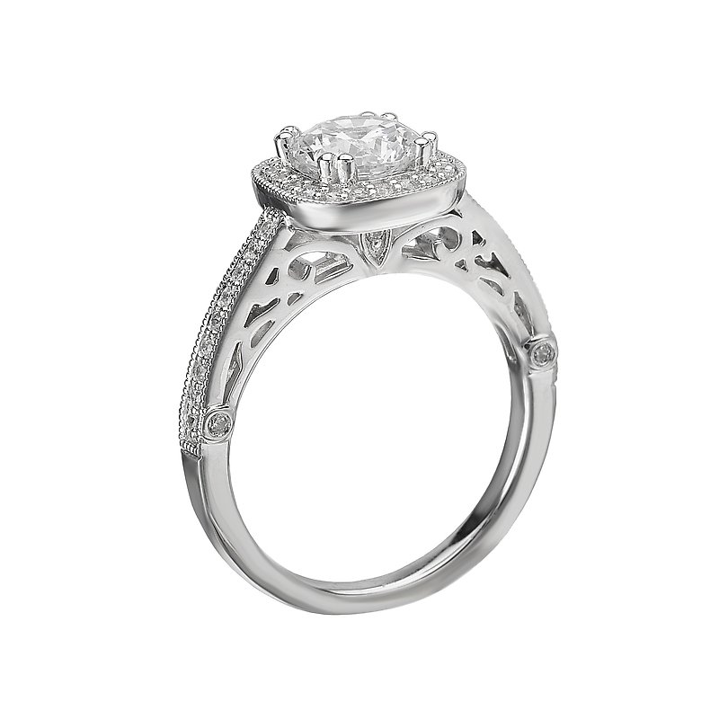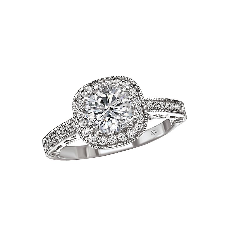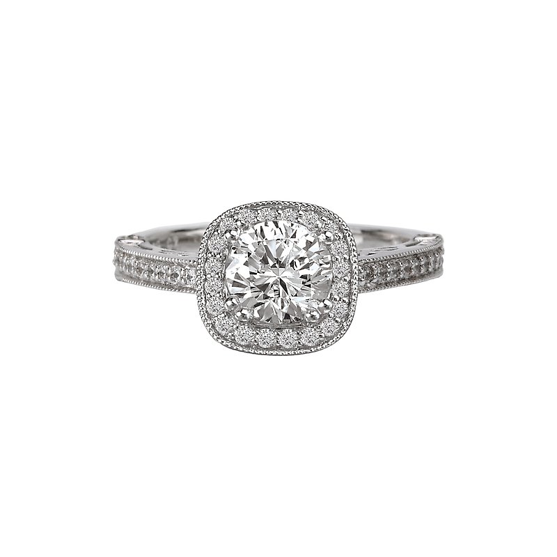 Halo diamond ring in 14kt white gold with filigree and milgrain detail. (D. 1/4 carat total weight) This item is a SEMI-MOUNT and it comes with NO CENTER STONE as shown but it will accommodate a 5.2mm round center stone.