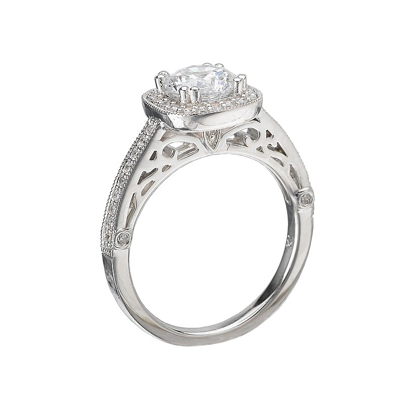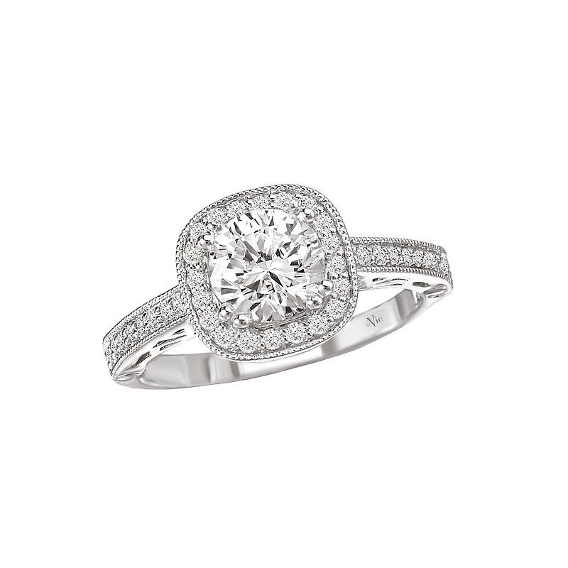Halo diamond ring in 14kt white gold with filigree and milgrain detail. (D. 1/4 carat total weight) This item is a SEMI-MOUNT and it comes with NO CENTER STONE as shown but it will accommodate a 6.5mm round center stone.