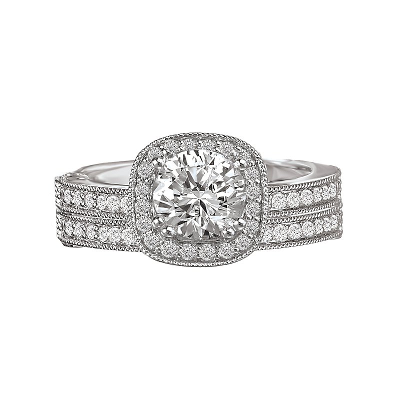 Halo diamond ring in 14kt white gold with filigree and milgrain detail. (D. 1/4 carat total weight) This item is a SEMI-MOUNT and it comes with NO CENTER STONE as shown but it will accommodate a 5.2mm round center stone.