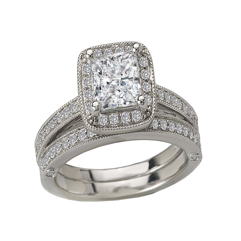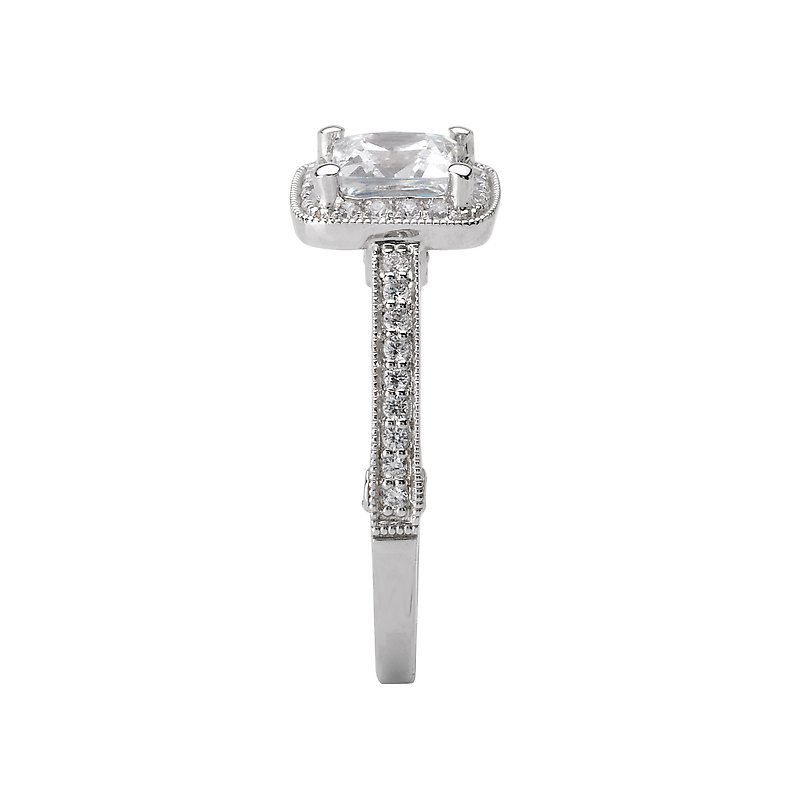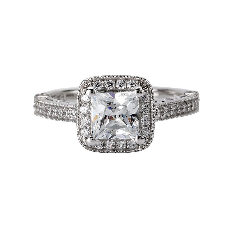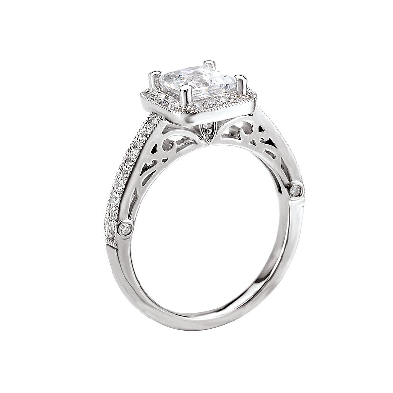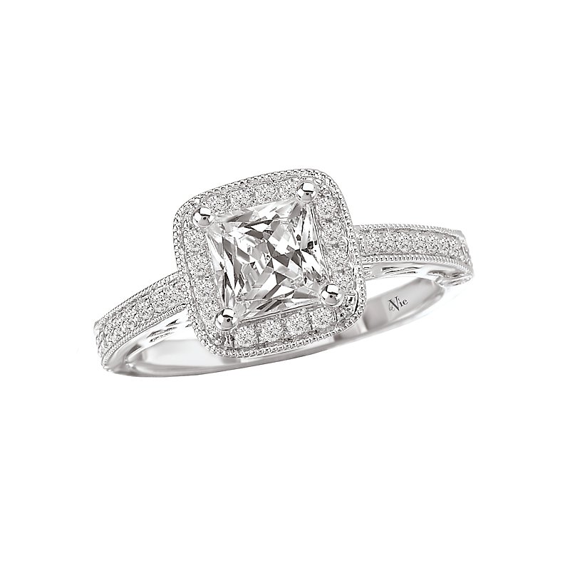 Square Halo Diamond Engagement Ring in 14kt White Gold with Milgrain and Filigree Detail. (D.1/4 carat total weight) This item is a SEMI-MOUNT and it comes with NO CENTER STONE as shown but it will accommodate a 5.5mm princess cut center stone.