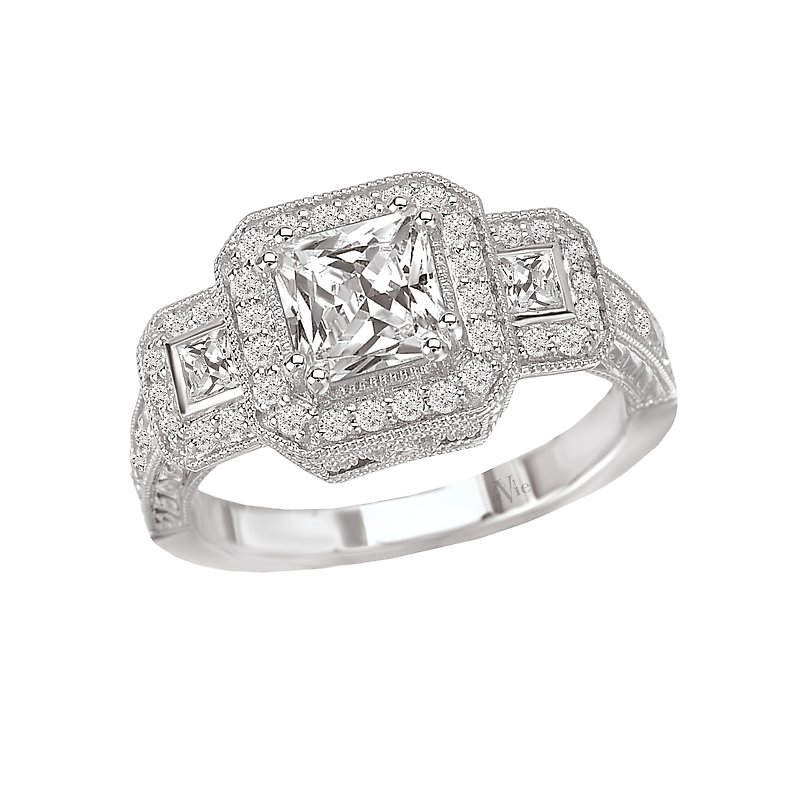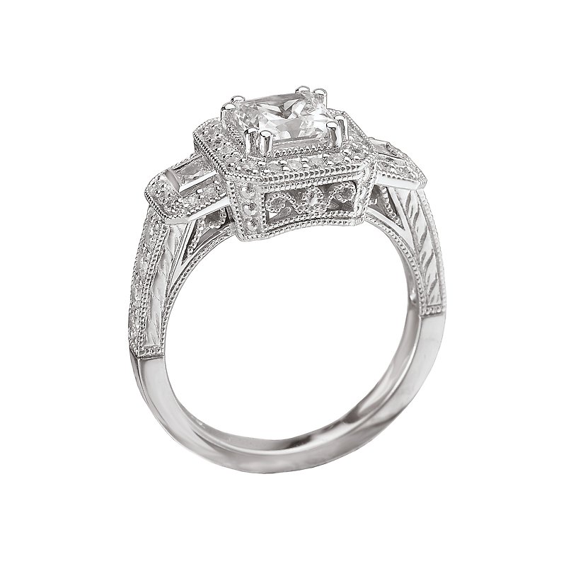Diamond Engagement Ring in 14kt White Gold. (D.1/2 carat total weight) This item is a SEMI-MOUNT and it comes with NO CENTER STONE as shown but it will accommodate a 5.5mm Princess cut center stone.