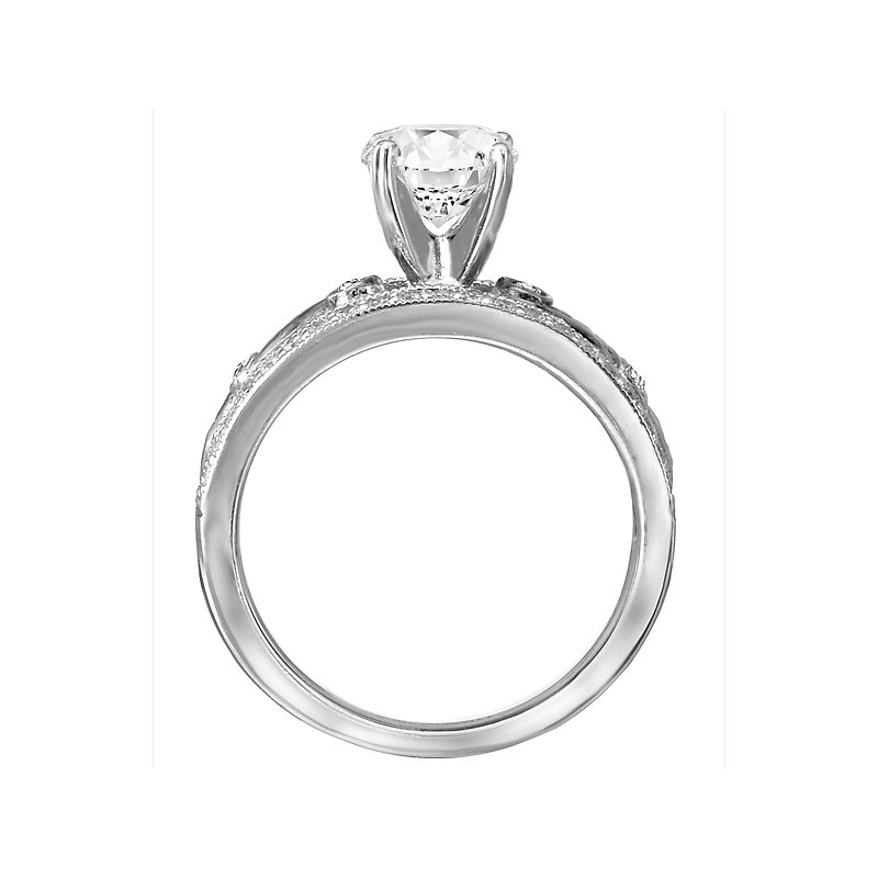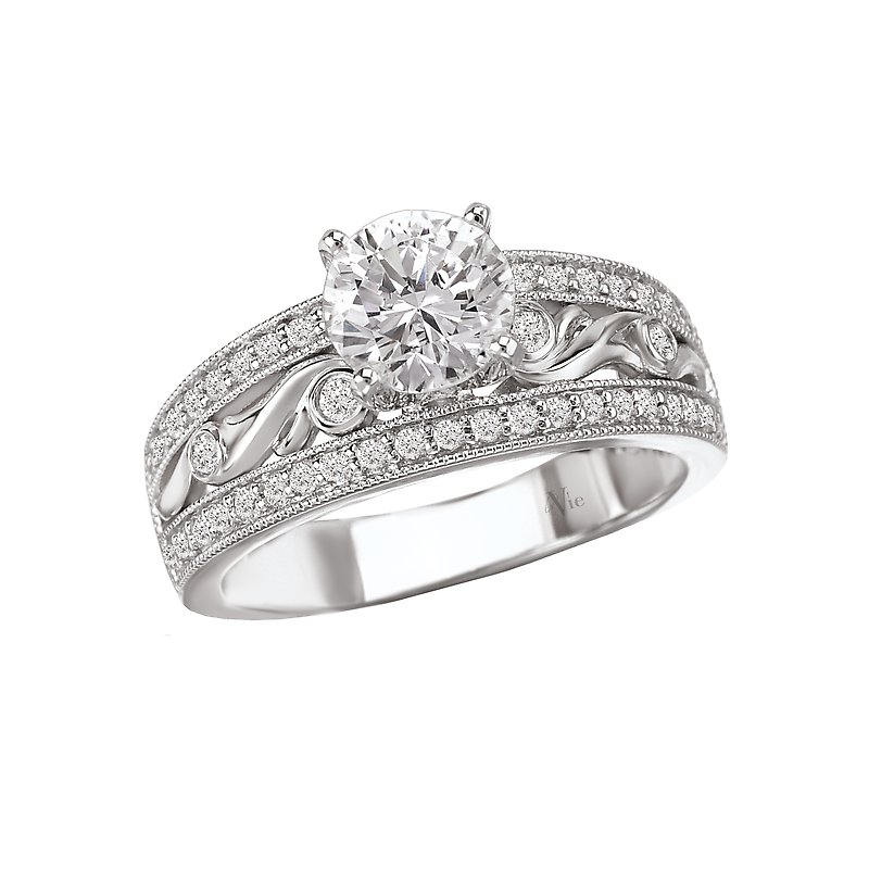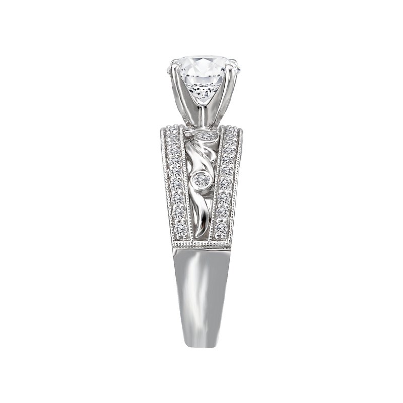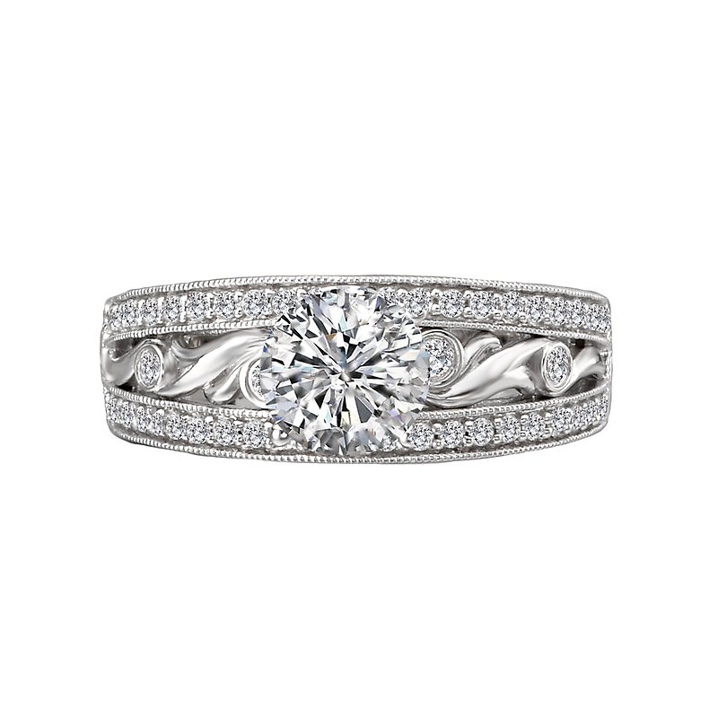 14kt White Gold Diamond Ring with a Floral Scroll Design and Milgrain on Band. (D.1/3 carat total weight) This item is a SEMI-MOUNT and it comes with NO CENTER STONE as shown but it will accommodate a 6.5mm round center stone. Peg Head.