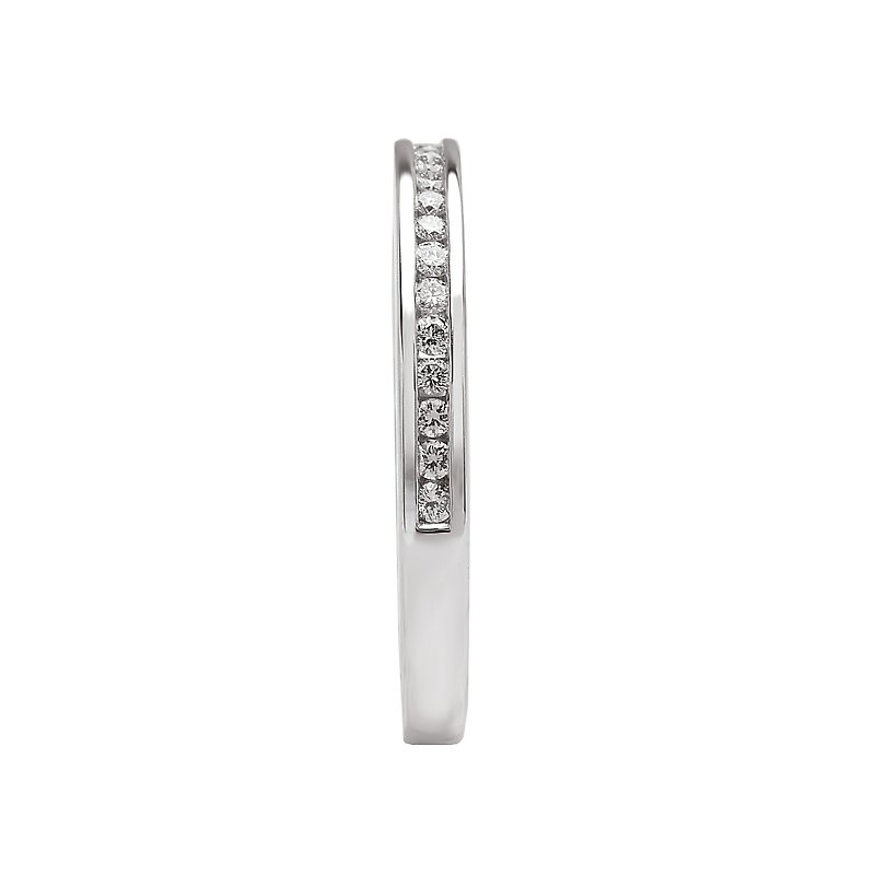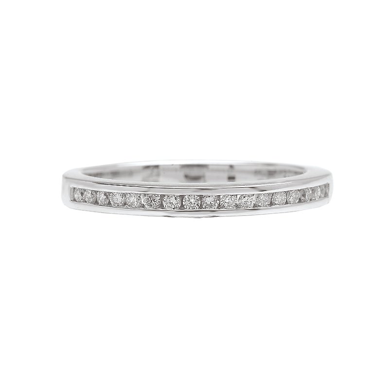 Graduated Round Diamond Channel Set Ring in 14kt White Gold. (D. 1/6 carat total weight) This item is a SEMI-MOUNT and it comes with NO CENTER STONE as shown but it will accommodate a 6.5mm round center stone. Peg Head