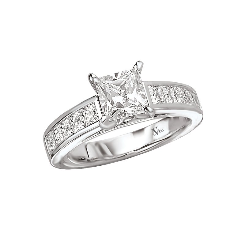 Channel Set Diamond Ring is crafted in high polished 14kt White Gold with a peg head center. (D 5/8 carat total weight) This peg head semi-mount ring comes with NO CENTER STONE as shown but it will accommodate a 5.5mm princess cut center stone.
