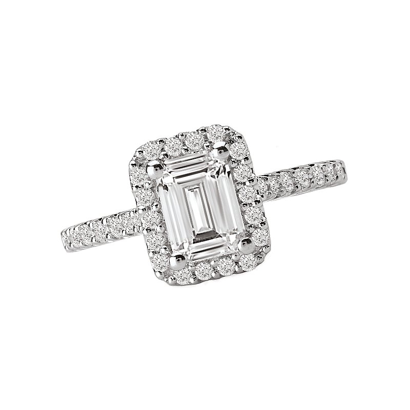 Emerald Style Halo Diamond Ring in 14kt White Gold with Milgrain Detail. (D. 3/8carat total weight) This item is a SEMI-MOUNT and it comes with NO CENTER STONE as shown but it will accommodate a 7X5mm emerald center stone.