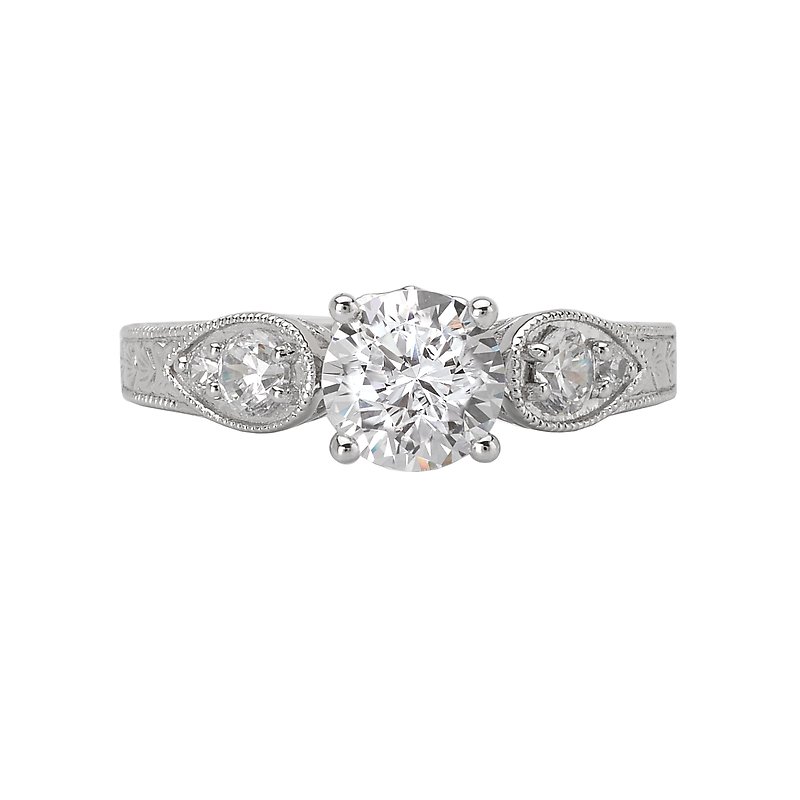 Diamond ring in 14kt white gold with scroll and milgrain detail surrounding the peg head center. (D.3/8 carat total weight) This peg head item is a SEMI-MOUNT and it comes with NO CENTER STONE as shown but it will accommodate a 6.5mm round center stone. Peg Head