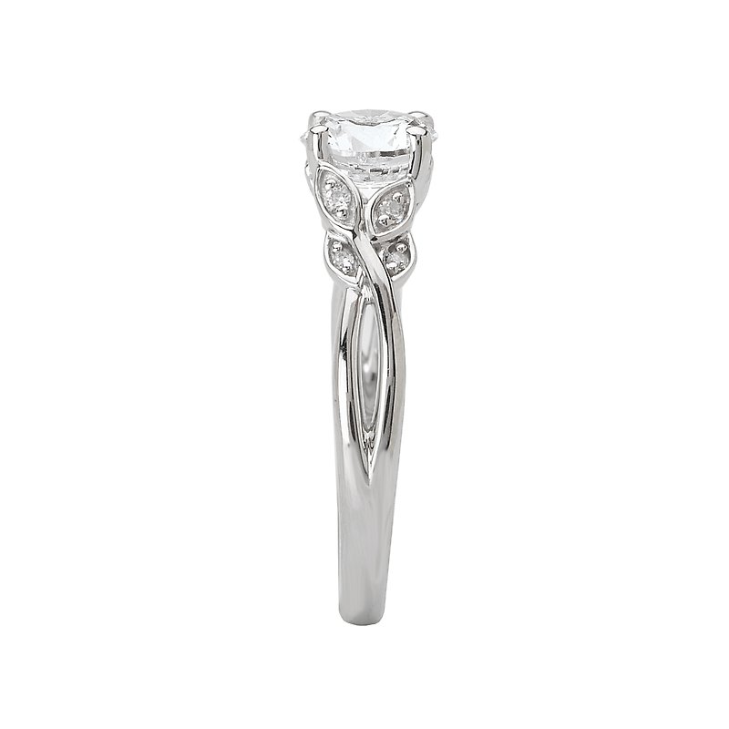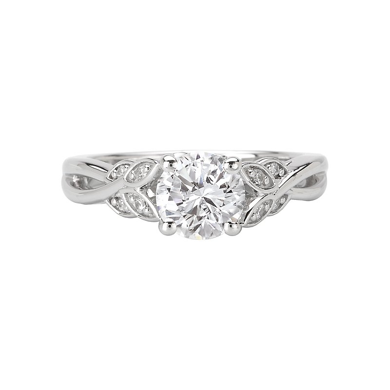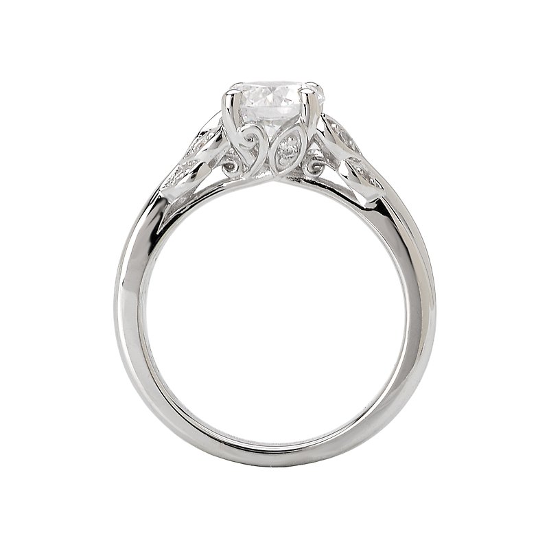 Diamond Engagement Ring in 14kt White Gold with Leaf Designs on the Shank. (D.08 carat total weight) This item is a SEMI-MOUNT and it comes with NO CENTER STONE as shown but it will accommodate a 6.5mm round center stone.