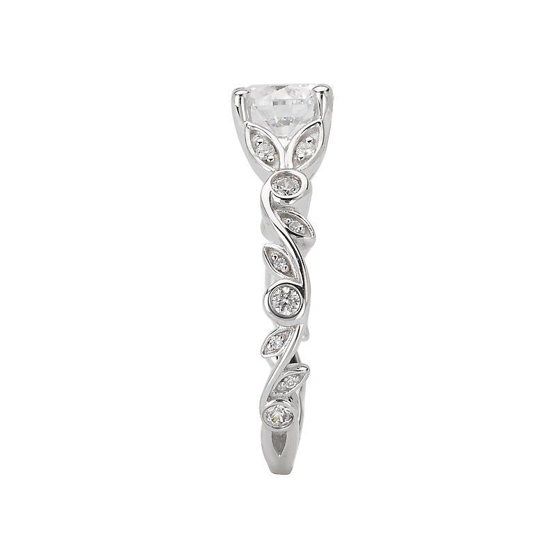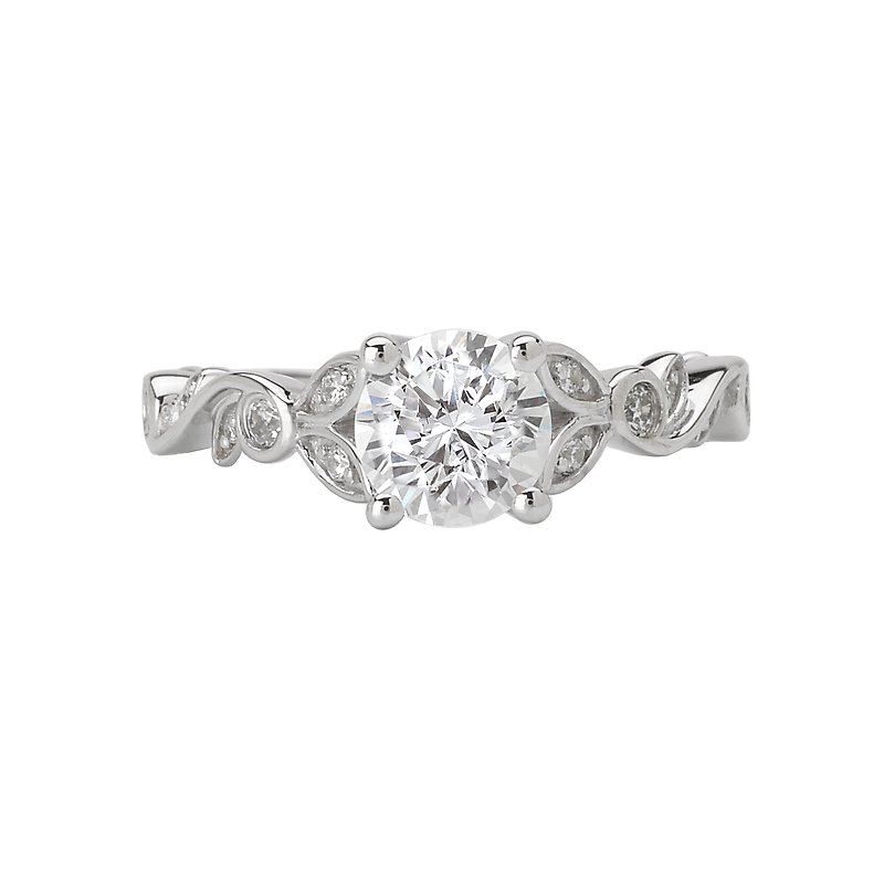 Trellis Diamond Ring in 14kt White Gold with Leaf Shapes on the Side of the Shank. (D 1/5 carat total weight) This item is a SEMI-MOUNT and it comes with NO CENTER STONE as shown but it will accommodate a 6.5mm round center stone.
