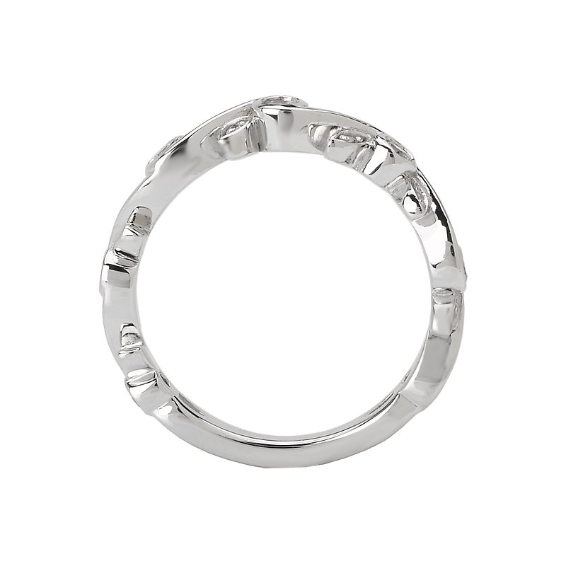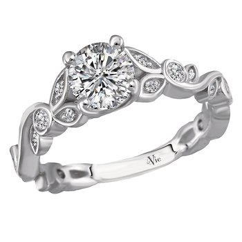 Trellis diamond ring in 14kt white gold with leaf designs on the the shank. (D 1/5 carat total weight) This item is a SEMI-MOUNT and it comes with NO CENTER STONE as shown but it will accommodate a 5.8mm round center stone.