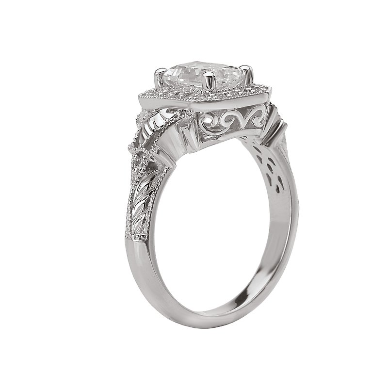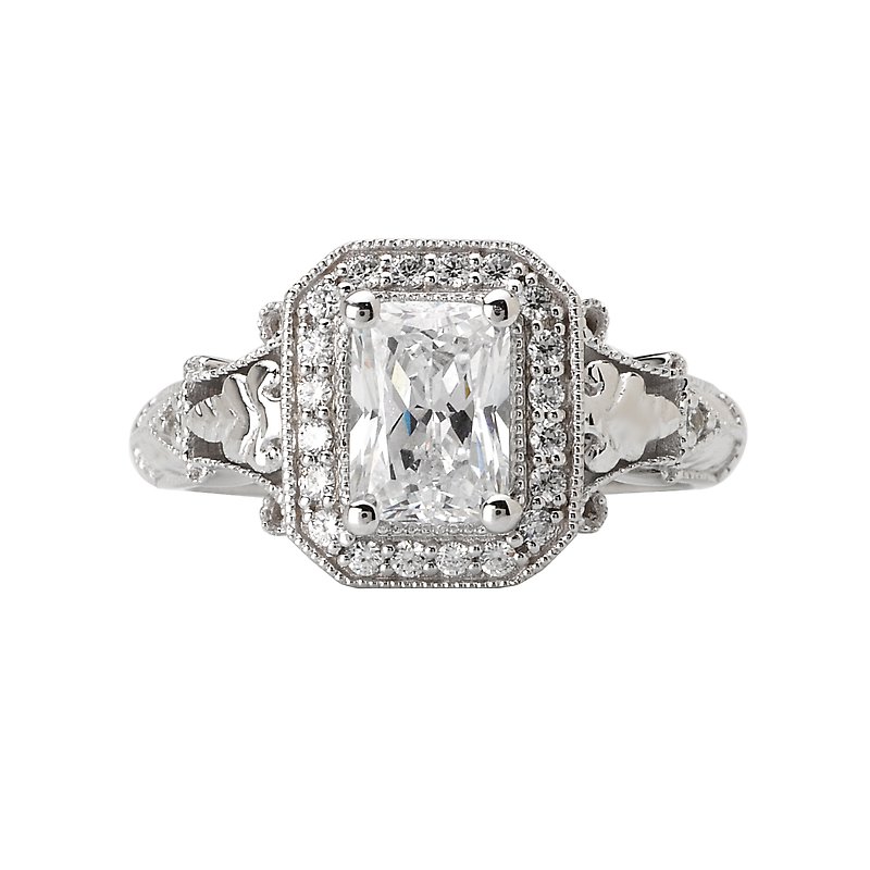 Emerald Shaped Halo Semi-Mount Diamond Ring in 14kt White Gold with Milgrain Detail. (D.1/5 carat total weight)This item is a SEMI-MOUNT and it comes with NO CENTER STONE as shown but it will accommodate a 7x5mm emerald cut center stone.