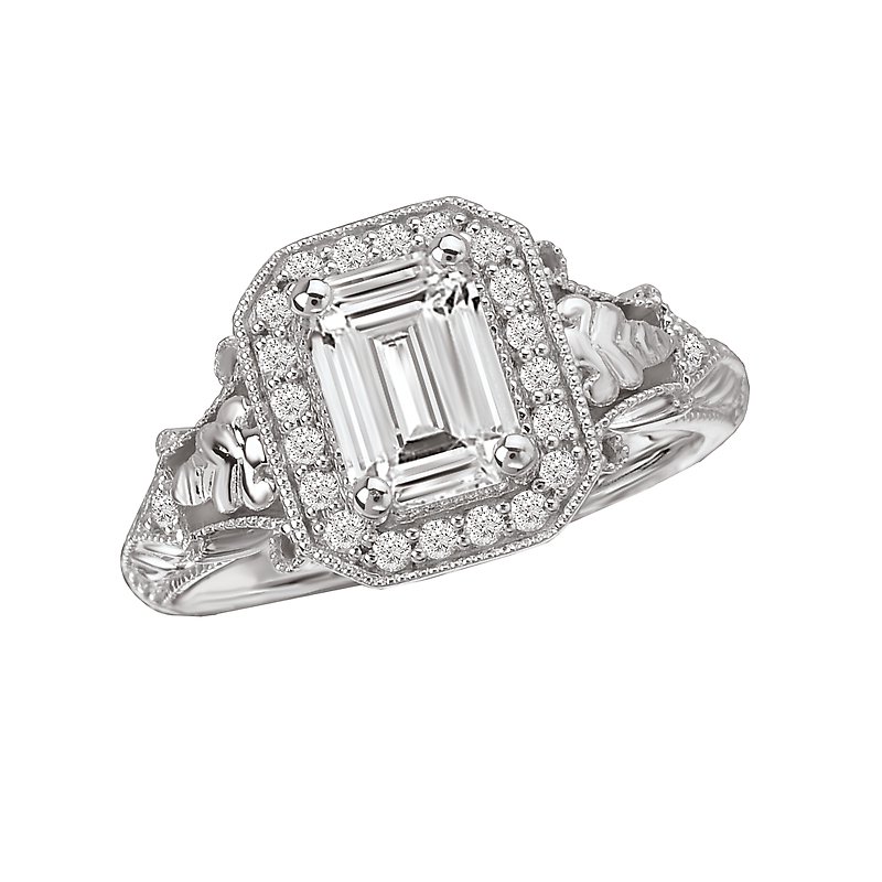 Emerald Shaped Halo Semi-Mount Diamond Ring in 14kt White Gold with Milgrain Detail. (D.1/5 carat total weight)This item is a SEMI-MOUNT and it comes with NO CENTER STONE as shown but it will accommodate a 7x5mm emerald cut center stone.