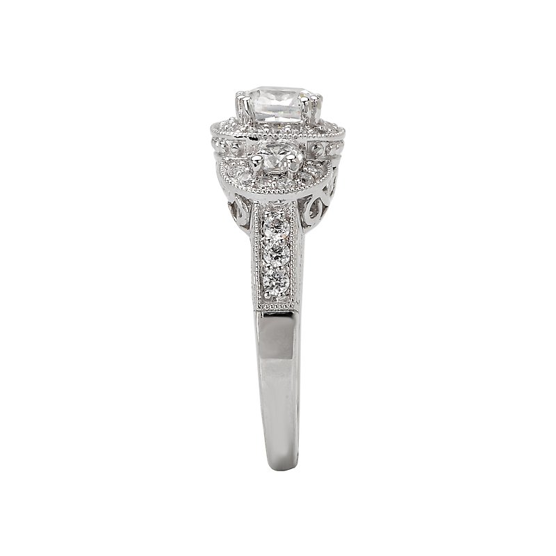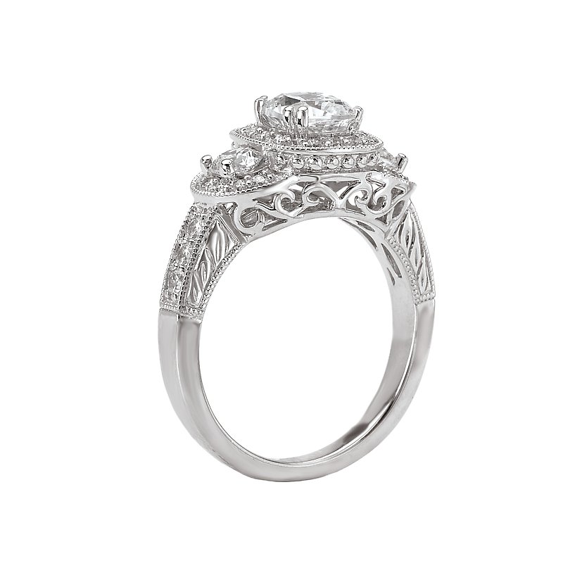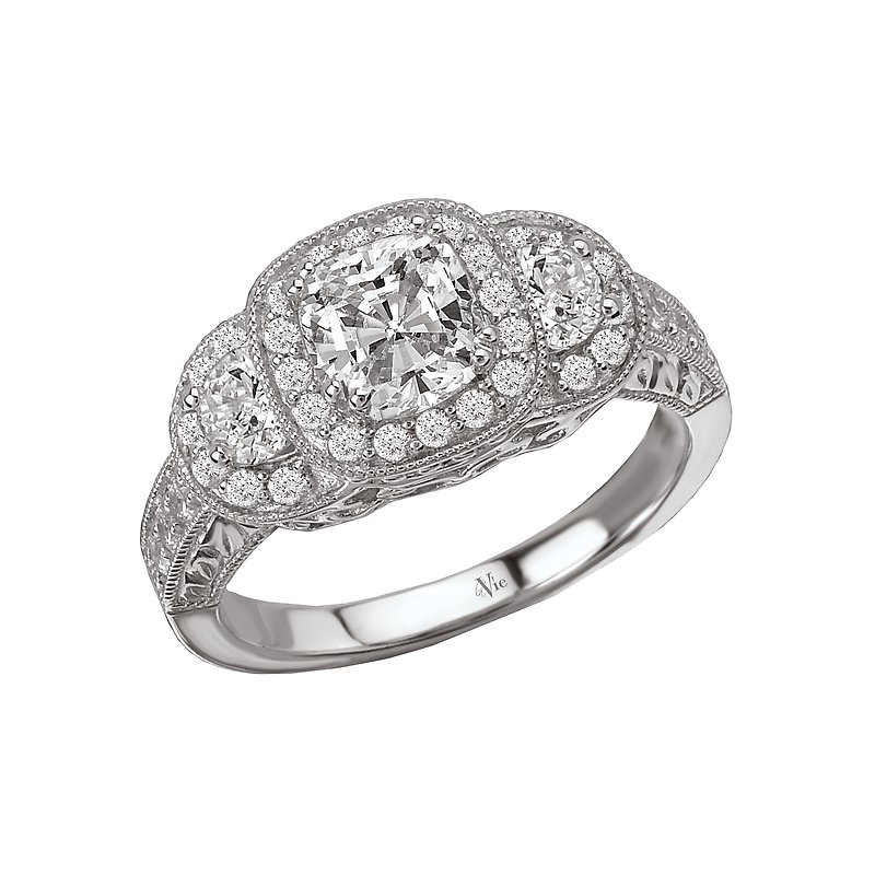 3-Stone Look with a Cushion Style Halo Center Diamond Ring in 14kt White Gold with Milgrain Detail. (D.1/2 carat total weight) This item is a SEMI-MOUNT and it comes with NO CENTER STONE as shown but it will accommodate a 5.5mm cushion cut center stone.