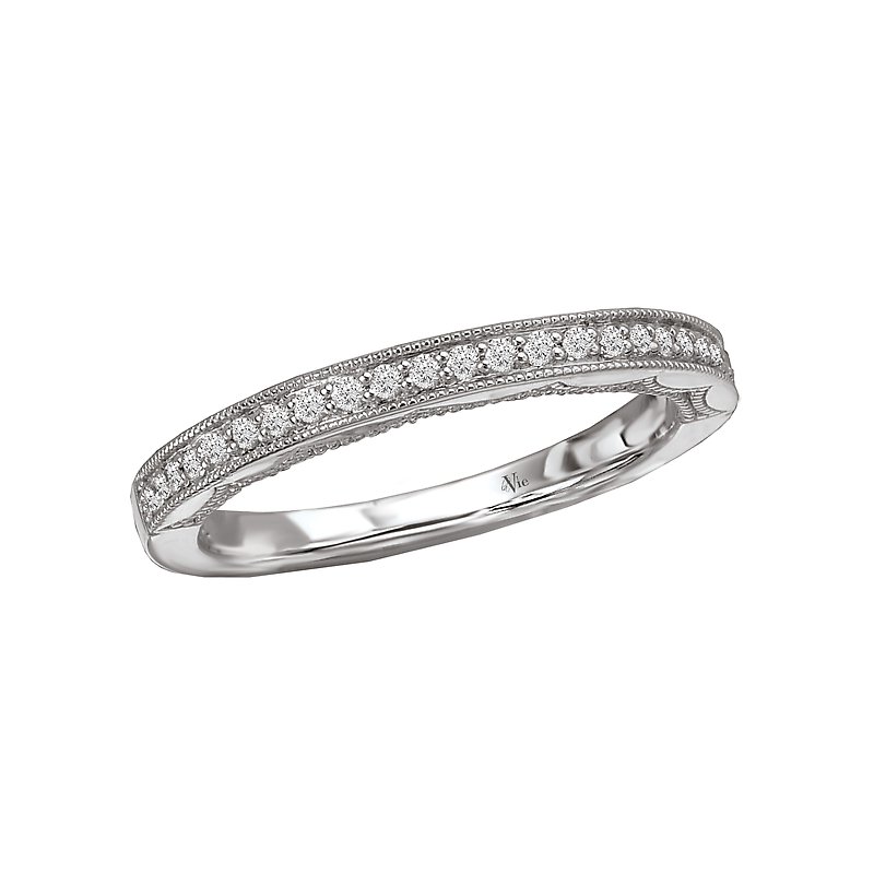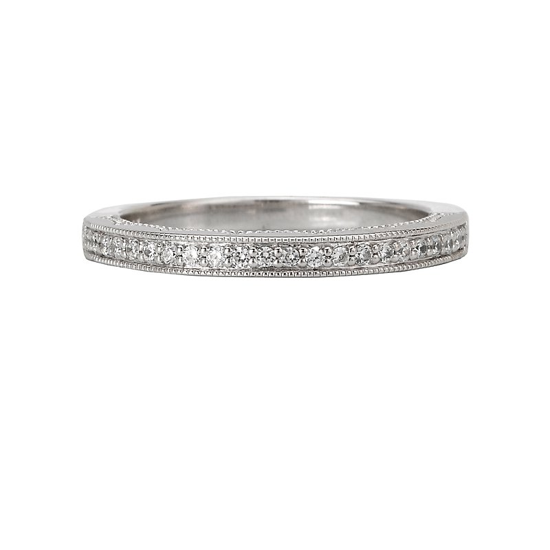 Gorgeous matching wedding band with milgrain detail crafted in high polished 14k white gold with round faceted diamonds. (D 1/8 carat total weight)