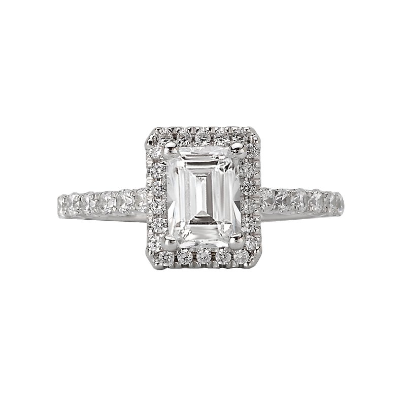 Emerald Style Halo Diamond Wedding Ring in 14kt White Gold. (D. 1/3 carat total weight)This item is a SEMI-MOUNT and it comes with NO CENTER STONE as shown but it will accommodate a 7x5mm emerald cut center stone.