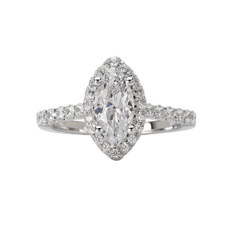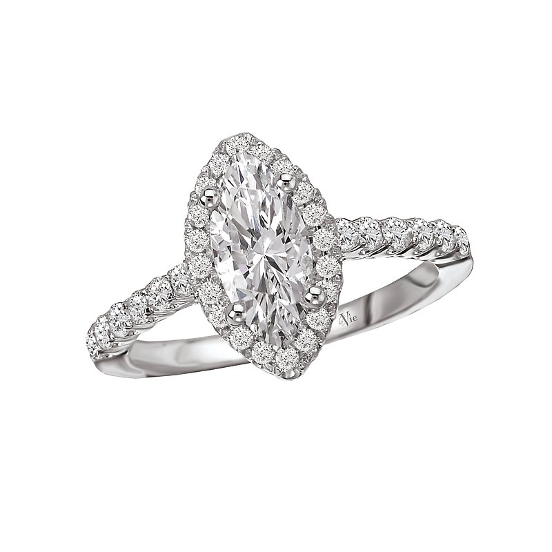 Marquise Shaped Halo Diamond Wedding Ring in 14kt White Gold. (D. 1/3 carat total weight) This item is a SEMI-MOUNT and it comes with NO CENTER STONE as shown but it will accommodate a 10x5mm marquise center stone.