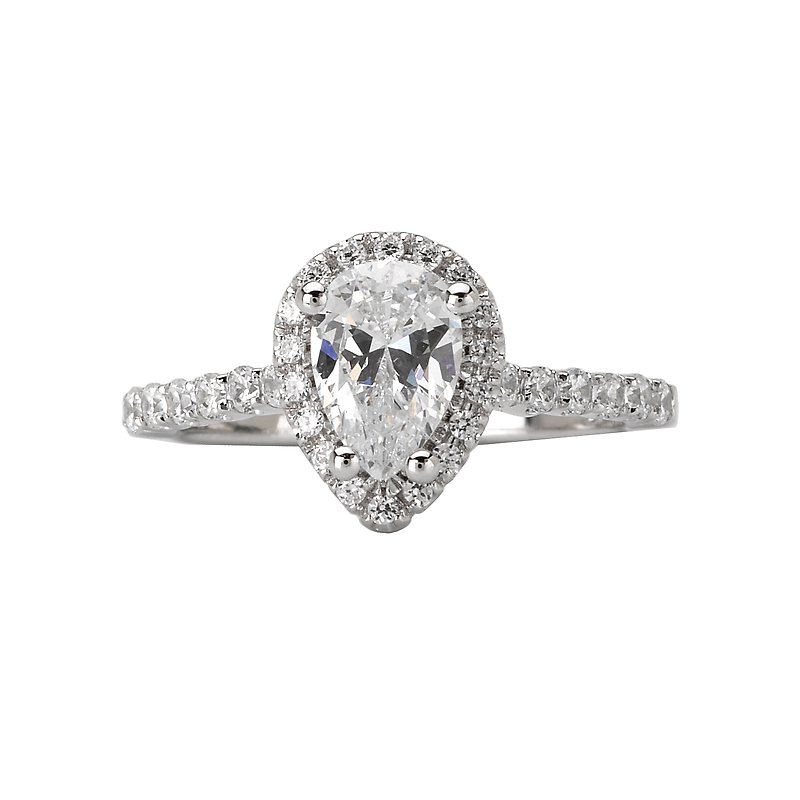 Pear Shaped Halo Diamond Wedding Ring in 14kt White Gold. (D 1/3 carat total weight) This item is a SEMI-MOUNT and it comes with NO CENTER STONE as shown but it will accommodate a 8x5.5mm pear shaped center stone.
