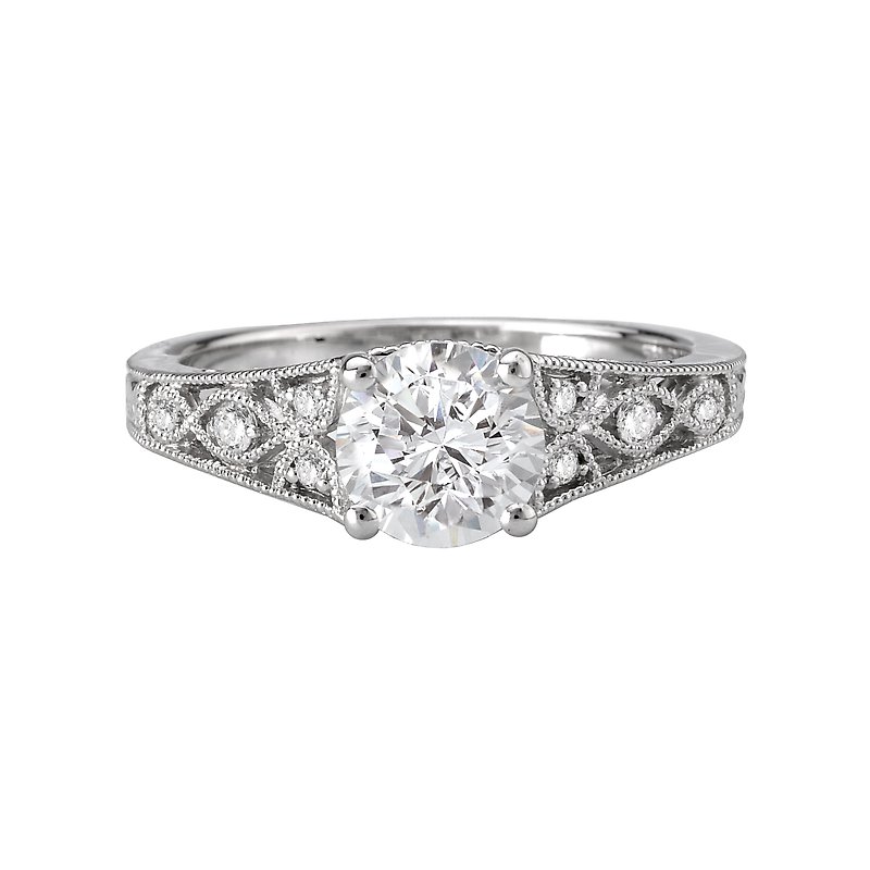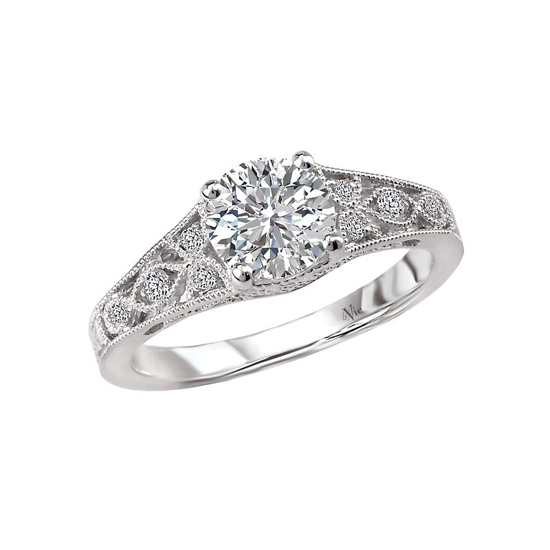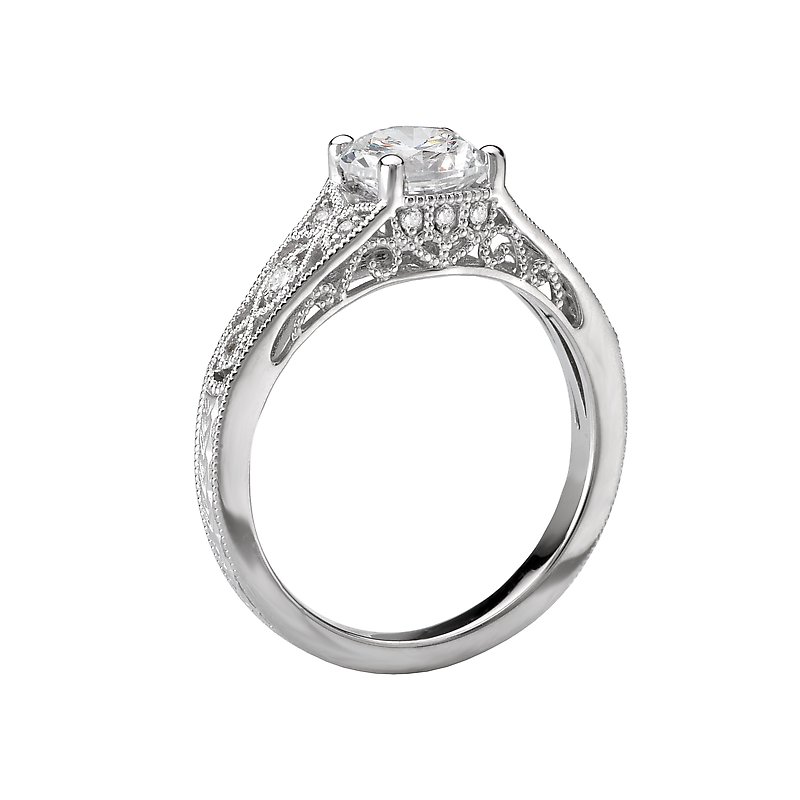 Diamond Ring in 14kt White Gold with Milgrain and Cut Out Detail. (D 1/10 carat total weight) This item is a SEMI-MOUNT and it comes with NO CENTER STONE as shown but it will accommodate a 6.5mm round center stone.