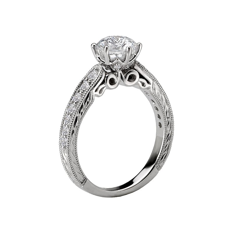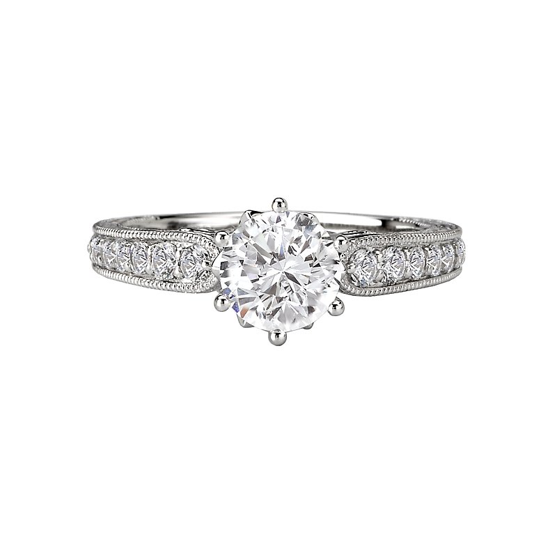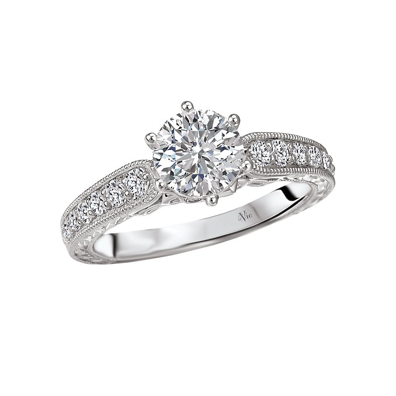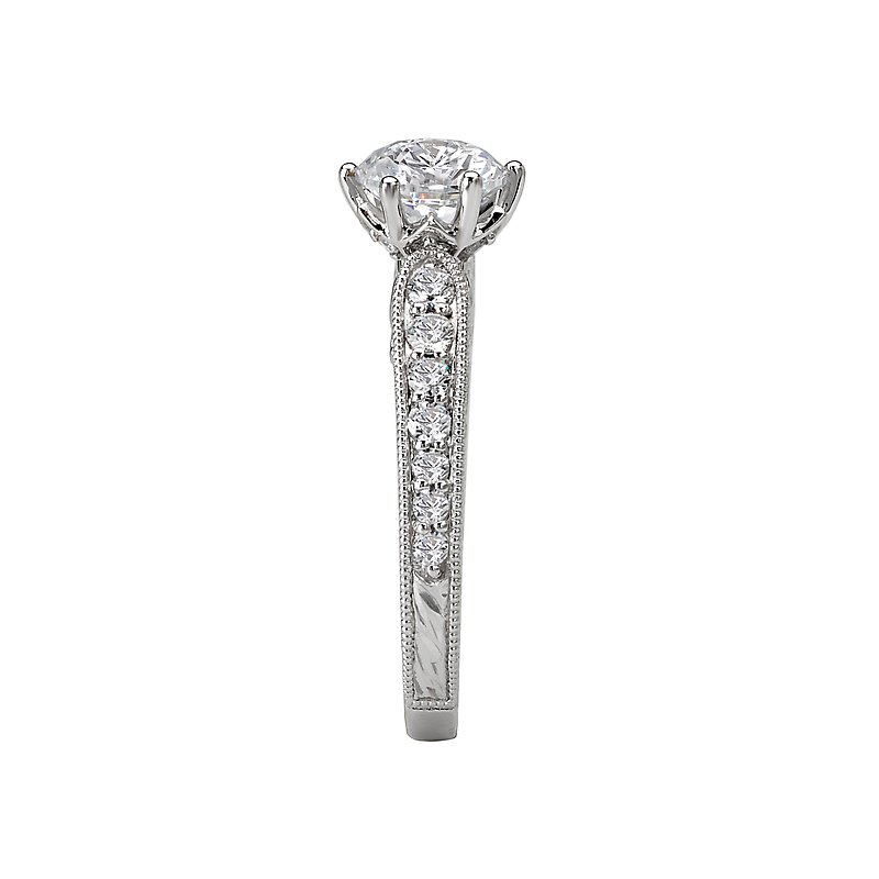 Diamond Ring in 14kt White Gold with Engraved and Milgrain Detail. (D 1/3 carat total weight) This item is a SEMI-MOUNT and it comes with NO CENTER STONE as shown but it will accommodate a 6.5mm round center stone. Fancy Peg Head