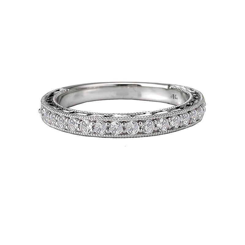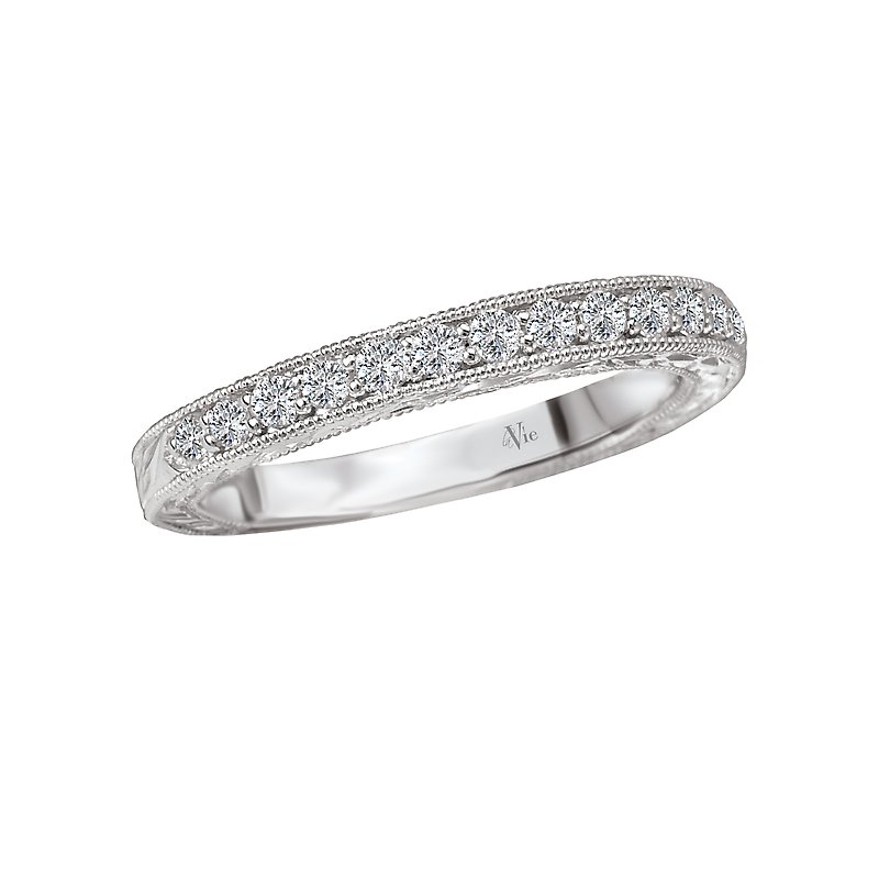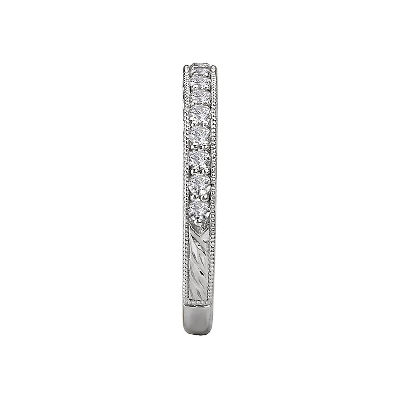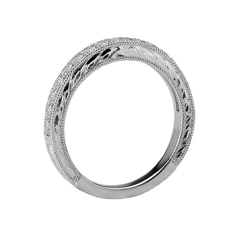 Matching Wedding Band in 14kt White Gold with Engraved and Milgrain Detail. (D 1/3 carat total weight)