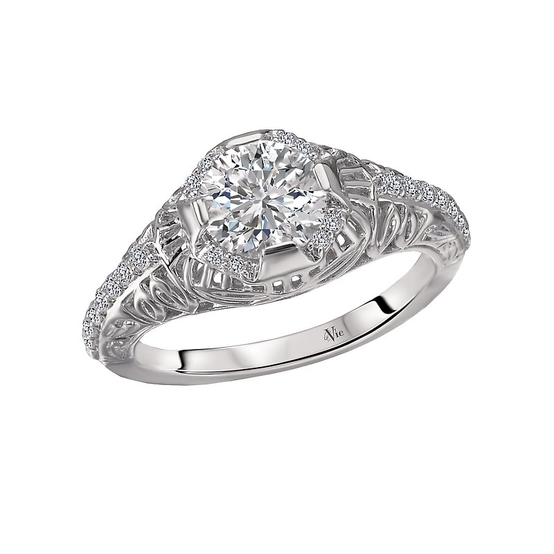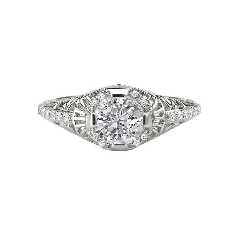 Vintage Diamond Ring in 14kt White Gold with a Gallary Back. (D 1/5 carat total weight) This item is a SEMI-MOUNT and it comes with NO CENTER STONE as shown but it will accommodate a 6.5mm round center stone.