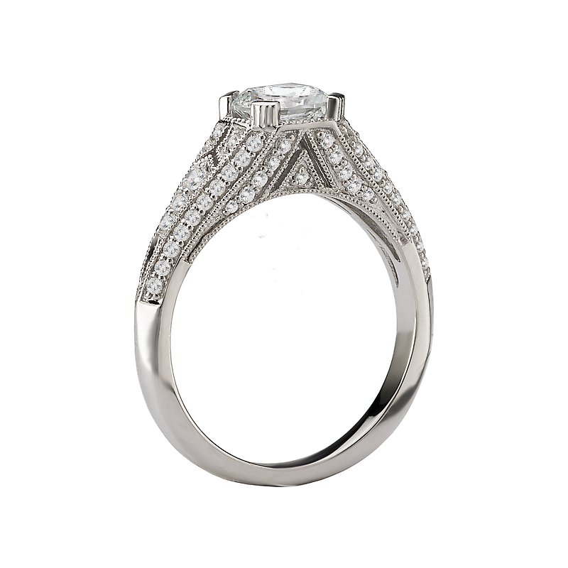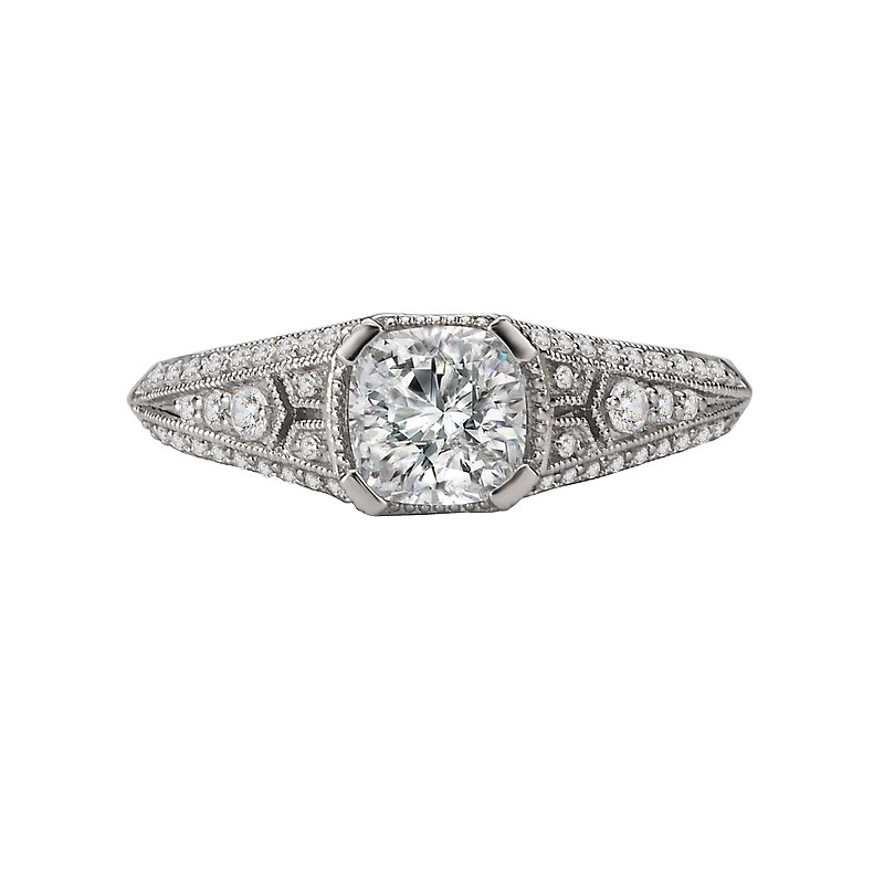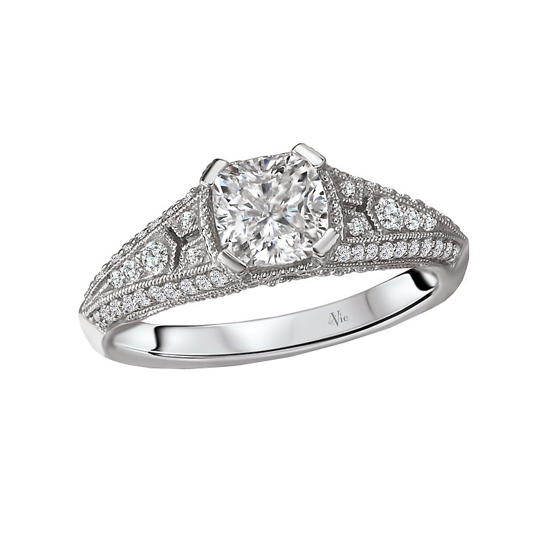 Vintage Style Semi-Mount Diamond Ring in 14kt White Gold with Engraving and Milgrain Detail. (D 1/3 carat total weight) This item is a SEMI-MOUNT and it comes with NO CENTER STONE as shown but it will accommodate a 5.5mm cushion style center stone.