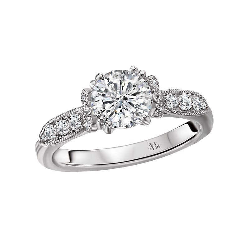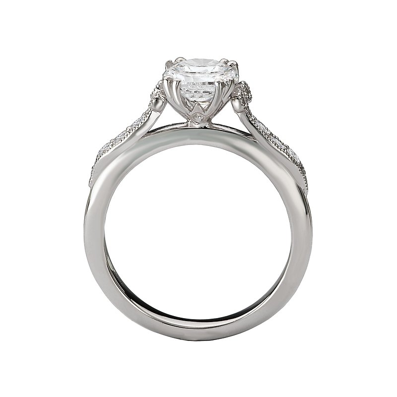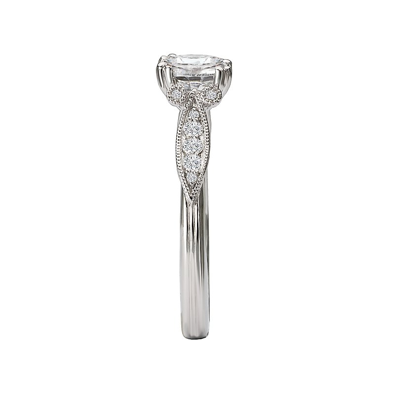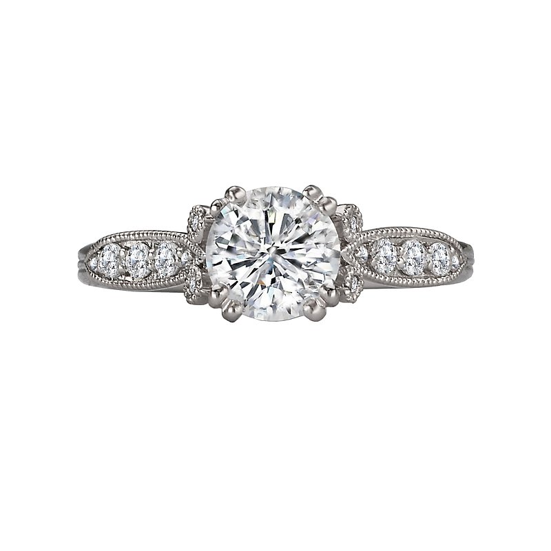 Diamond Ring in 14kt White Gold with Milgrain Detail. (D 1/7 carat total weight) This item is a SEMI-MOUNT and it comes with NO CENTER STONE as shown but it will accommodate a 6.5mm round center stone.