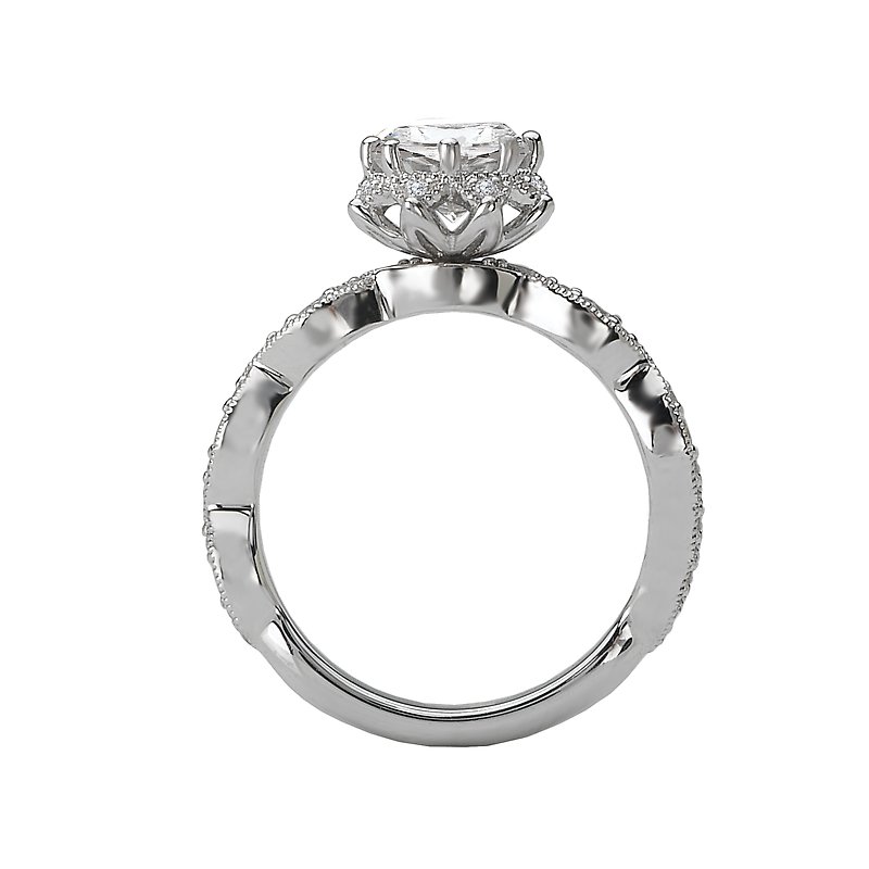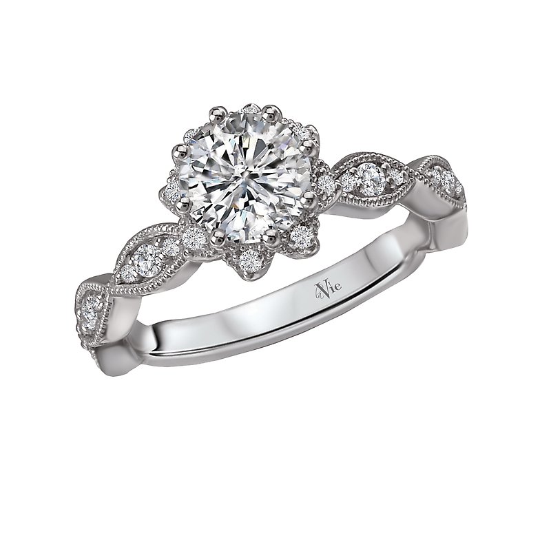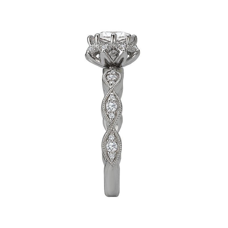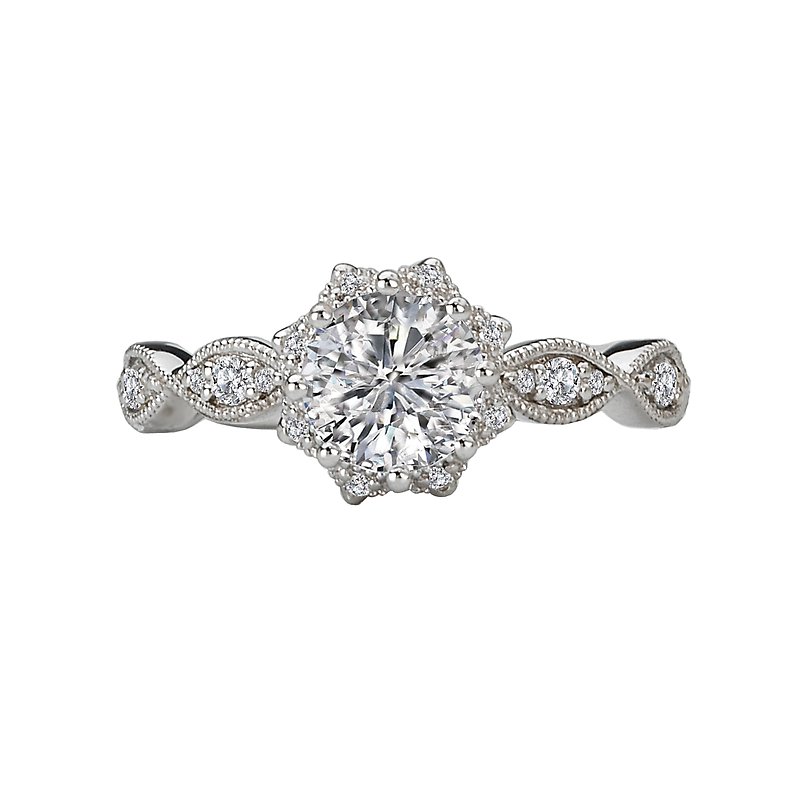 This bridal ring has a floral shaped halo outlined in round sparkling diamonds set in high polished 14kt White Gold with Milgrain Detail. (D 1/4 carat total weight) This item is a SEMI-MOUNT and it comes with NO CENTER STONE as shown but it will accommodate a 6.5mm round center stone.