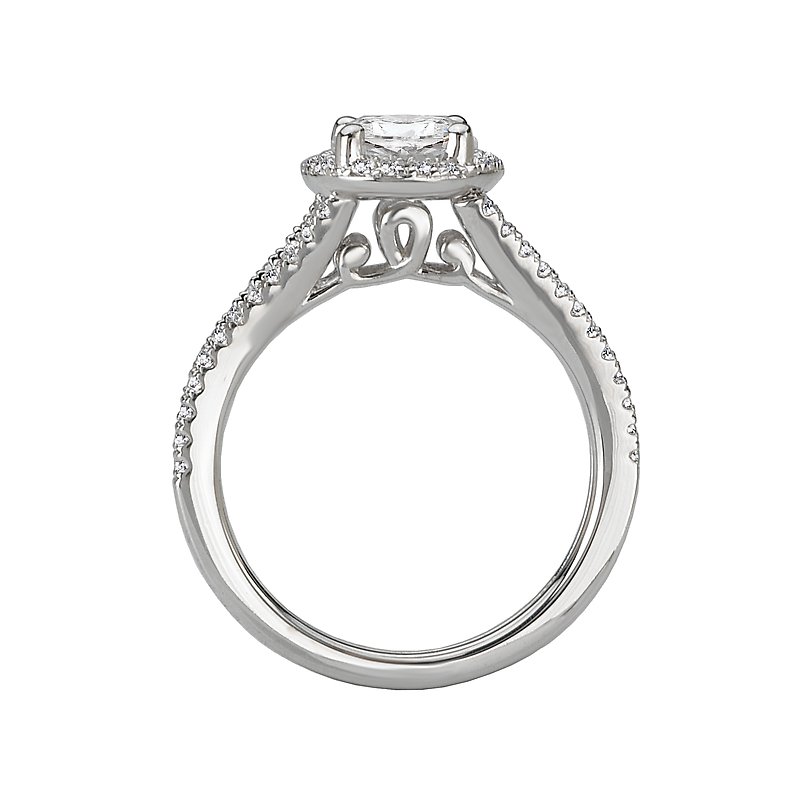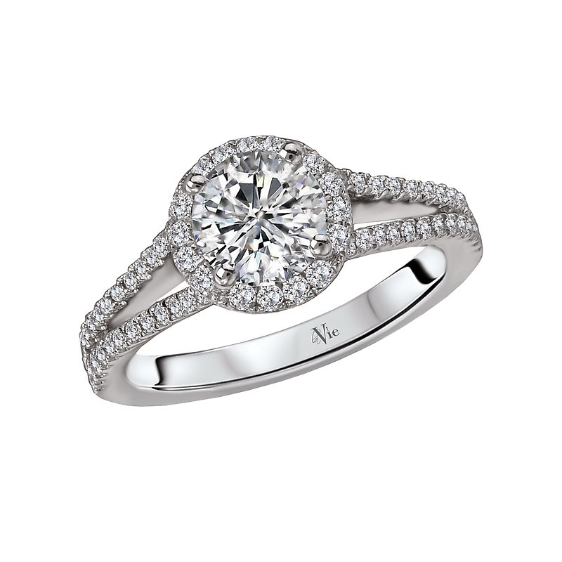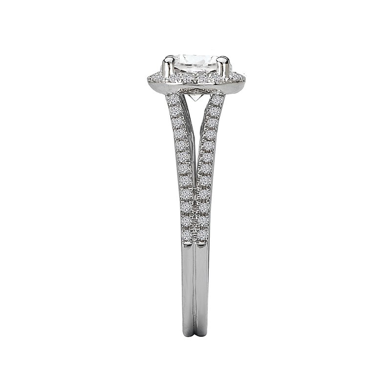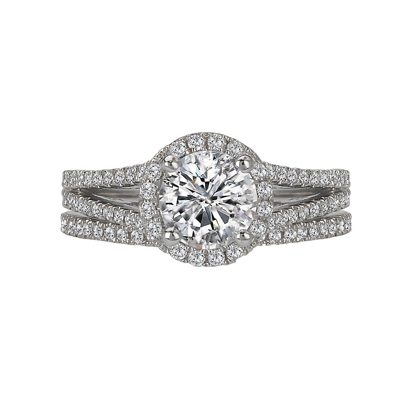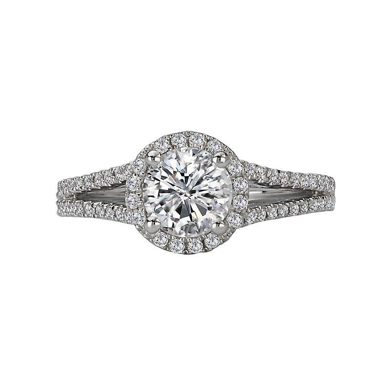 Split Shank Diamond Ring with a Round Halo in 14kt White Gold. (D 1/3 carat total weight) This item is a SEMI-MOUNT and it comes with NO CENTER STONE as shown but it will accommodate a 6.5mm round center stone.