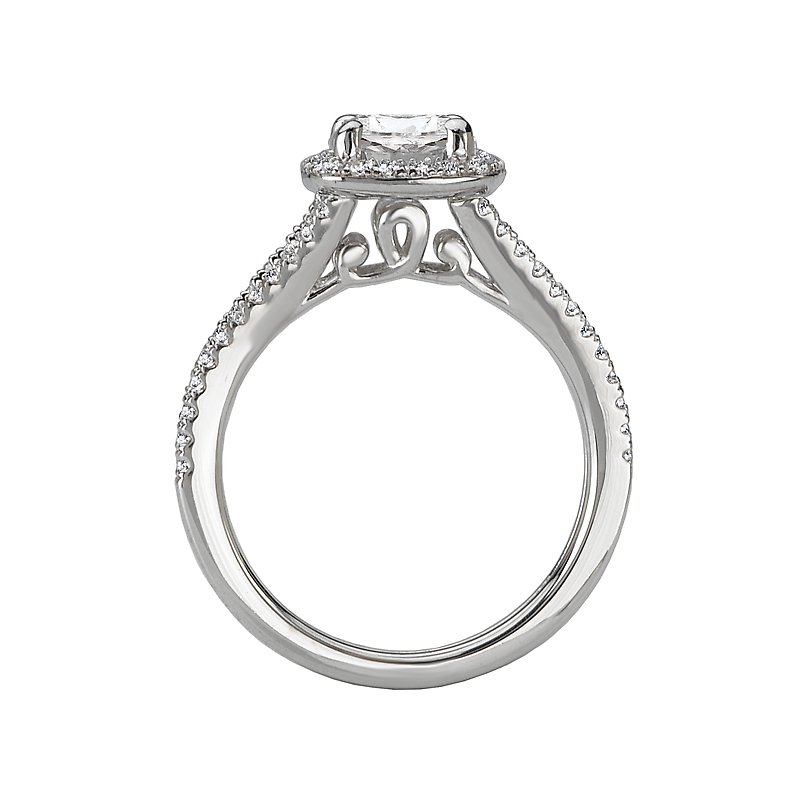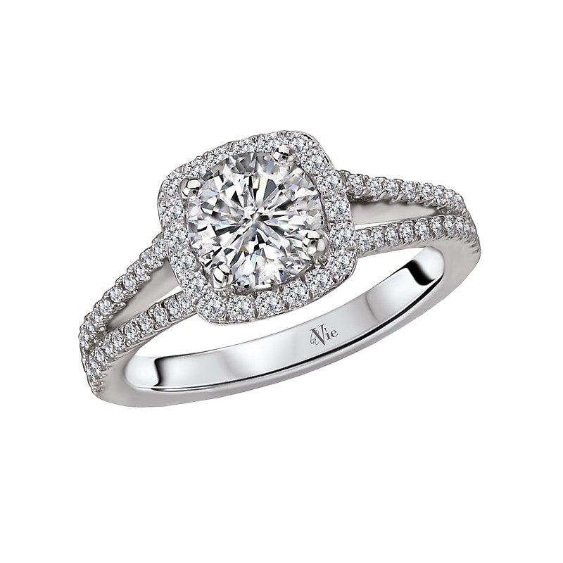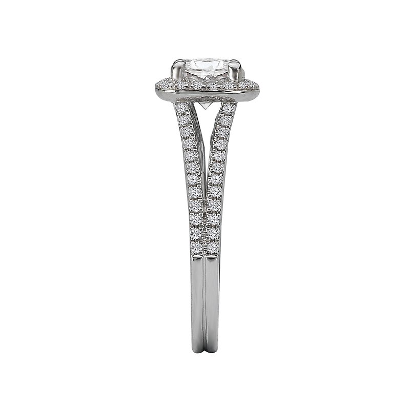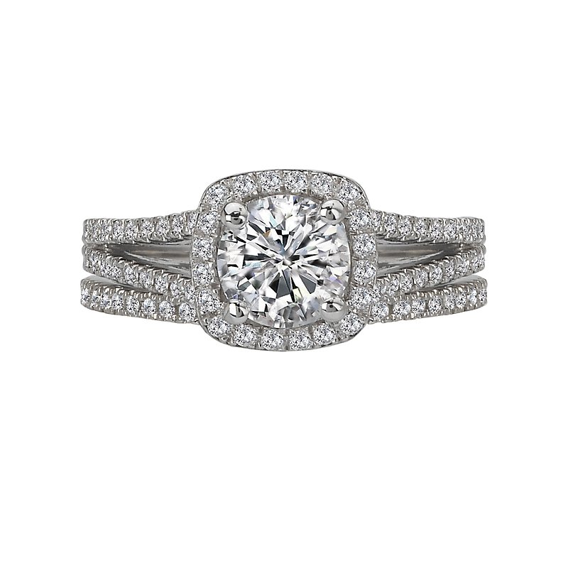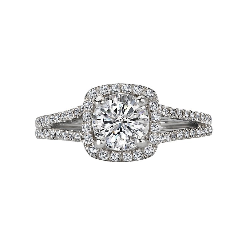 Cushion Shaped Halo Diamond Ring in 14kt White Gold with a Split Shank. (D 1/3 carat total weight) This item is a SEMI-MOUNT and it comes with NO CENTER STONE as shown but it will accommodate a 6.5mm round center stone.