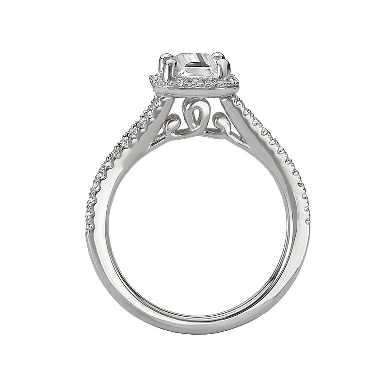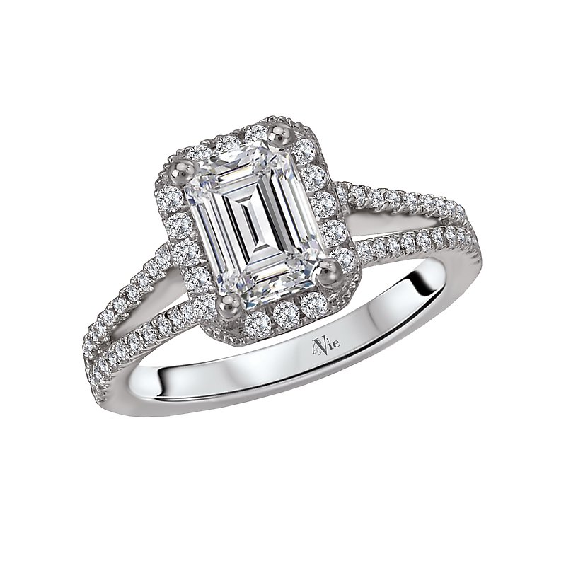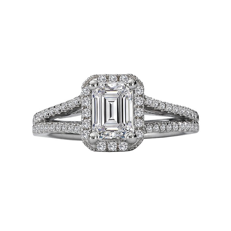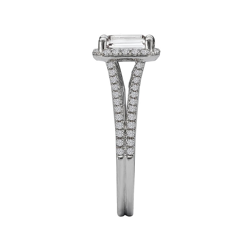 Emerald Shaped Halo Diamond Ring in 14kt White Gold with a Split Shank. (D 1/3 carat total weight) This item is a SEMI-MOUNT and it comes with NO CENTER STONE as shown but it will accommodate a 7x5mm emerald cut center stone.