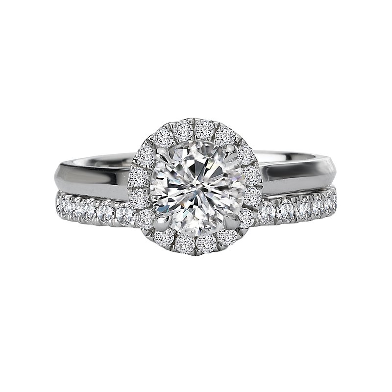 Round Halo Diamond Ring in 14kt White Gold. (D 1/6 carat total weight) This item is a SEMI-MOUNT and it comes with NO CENTER STONE as shown but it will accommodate a 6.5mm round center stone.