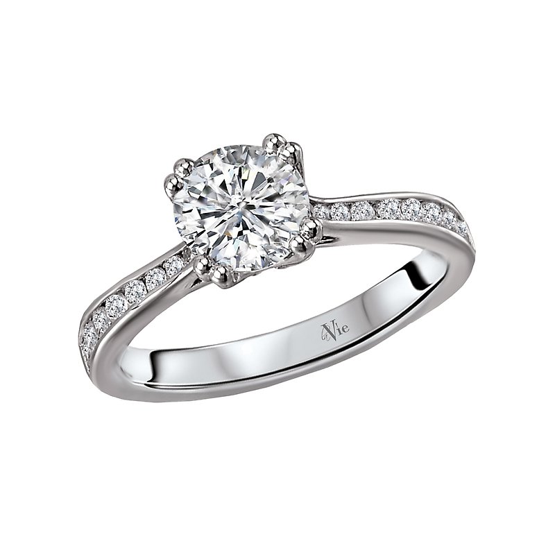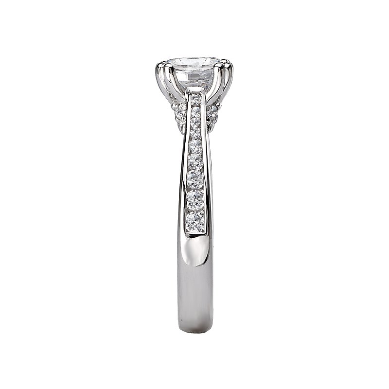 This engagement ring created in 14k white gold features tapered sparkling diamonds surrounding the center stone. (D 3/8 carat total weight) This ring is a SEMI-MOUNT and it comes with NO CENTER STONE as shown but it will accommodate a 6.5mm round center stone.