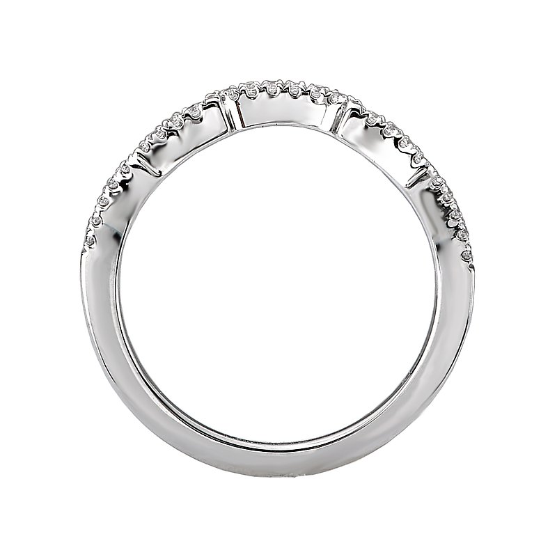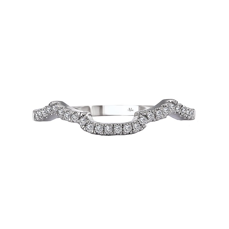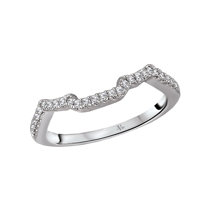 This is a scalloped wedding band crafted with round sparkling diamonds created in 14kt white gold. (D 1/8 carat total weight)