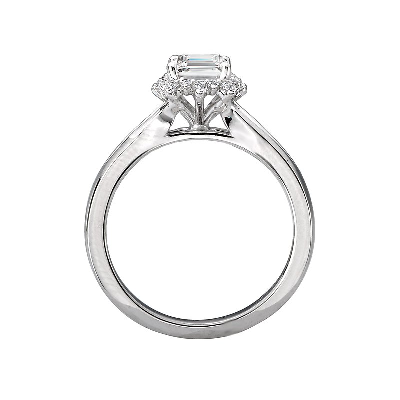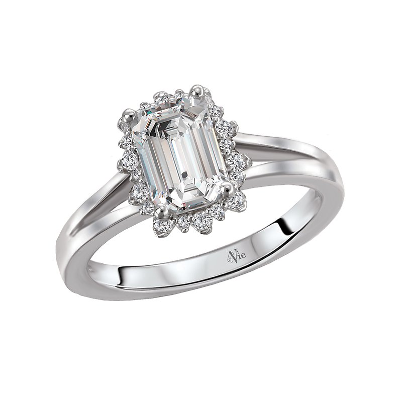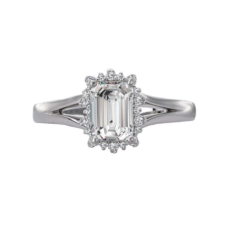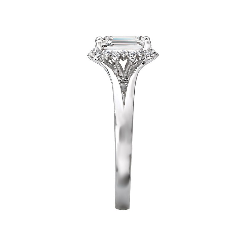 Elegant split shank ring features an emerald shaped halo of sparkling diamonds surrounding the center stone set in 14k white gold. (D 1/7 carat total weight) This ring is a SEMI-MOUNT and it comes with NO CENTER STONE as shown but it will accommodate a 7x5mm emerald center stone.