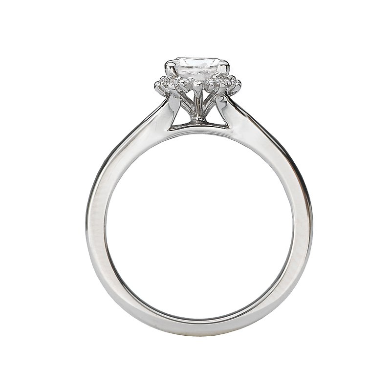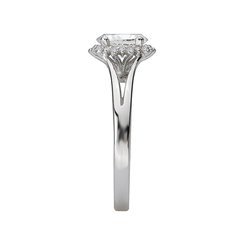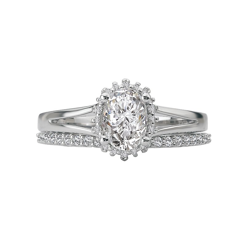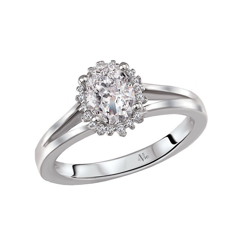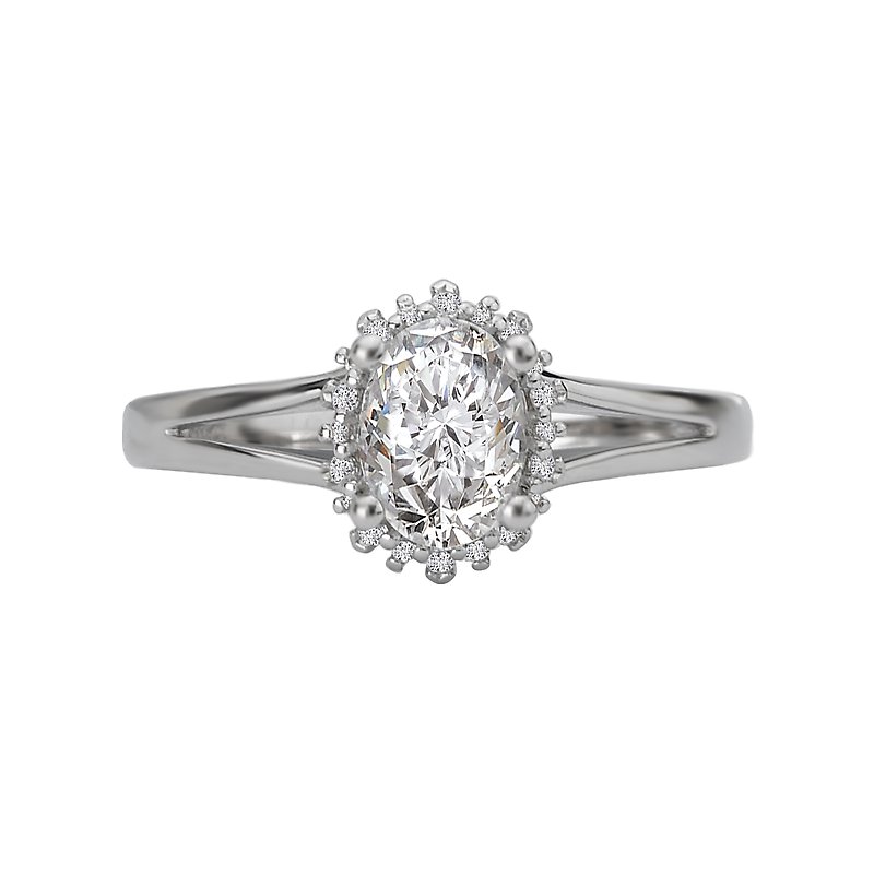 Gorgeous split shank ring features an oval halo of sparkling diamonds surrounding the center stone set in 14k white gold. (D 1/8 carat total weight) This ring is a SEMI-MOUNT and it comes with NO CENTER STONE as shown but it will accommodate a 7.5x5.5mm oval center stone.