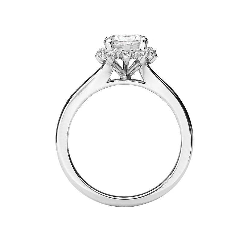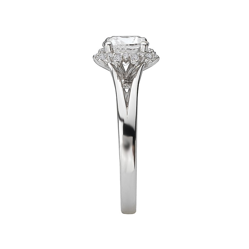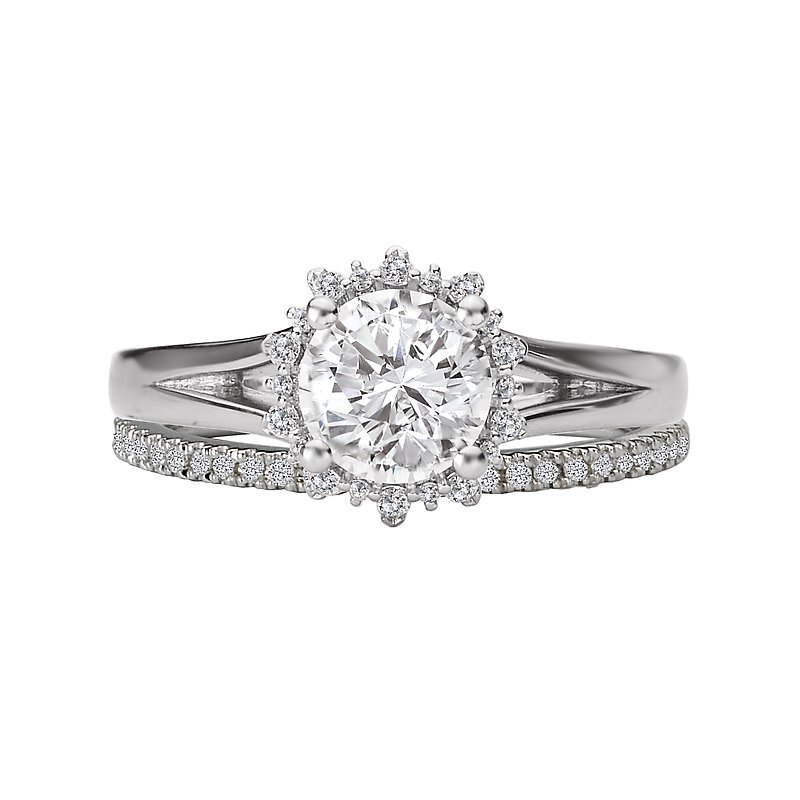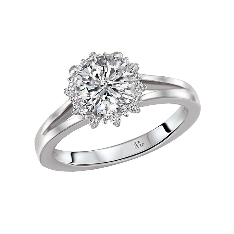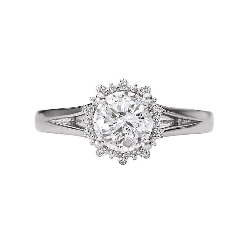 Gorgeous split shank ring features a round halo of sparkling diamonds surrounding the center stone set in 14k white gold. (D 1/7 carat total weight) This ring is a SEMI-MOUNT and it comes with NO CENTER STONE as shown but it will accommodate a 6.5mm round center stone.