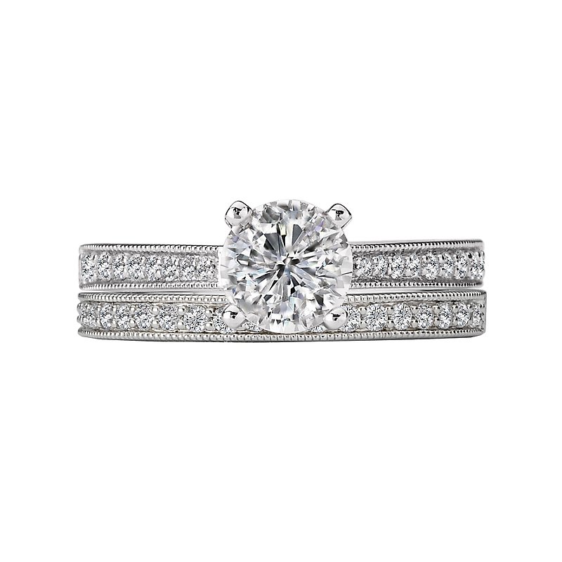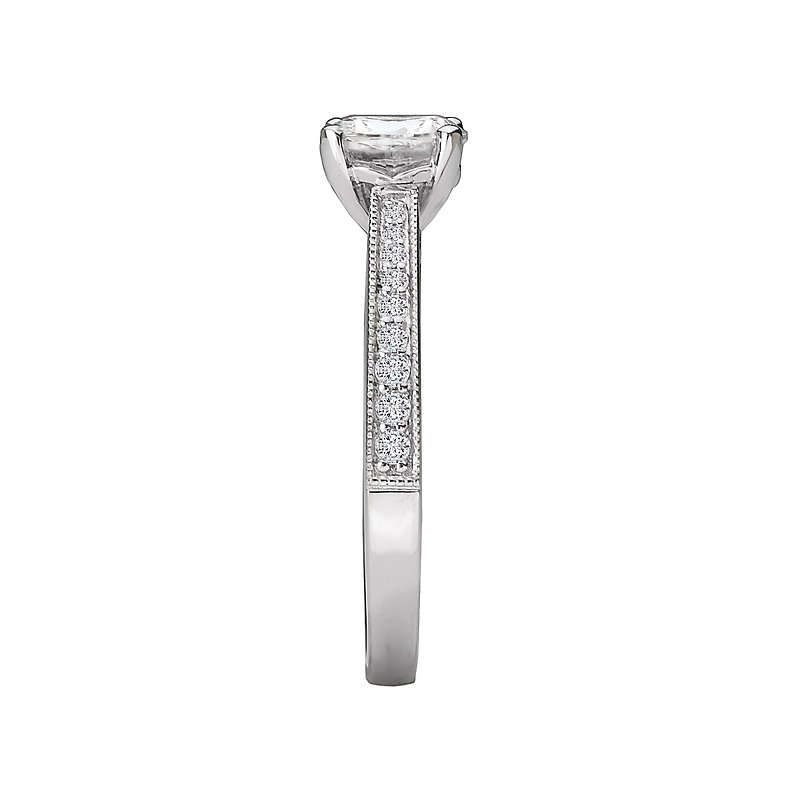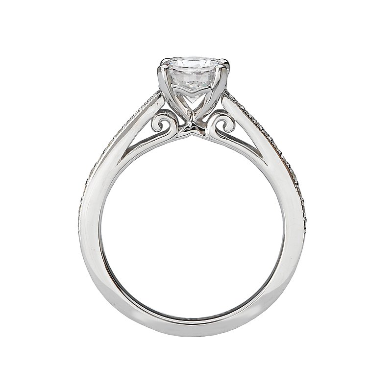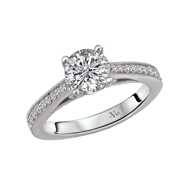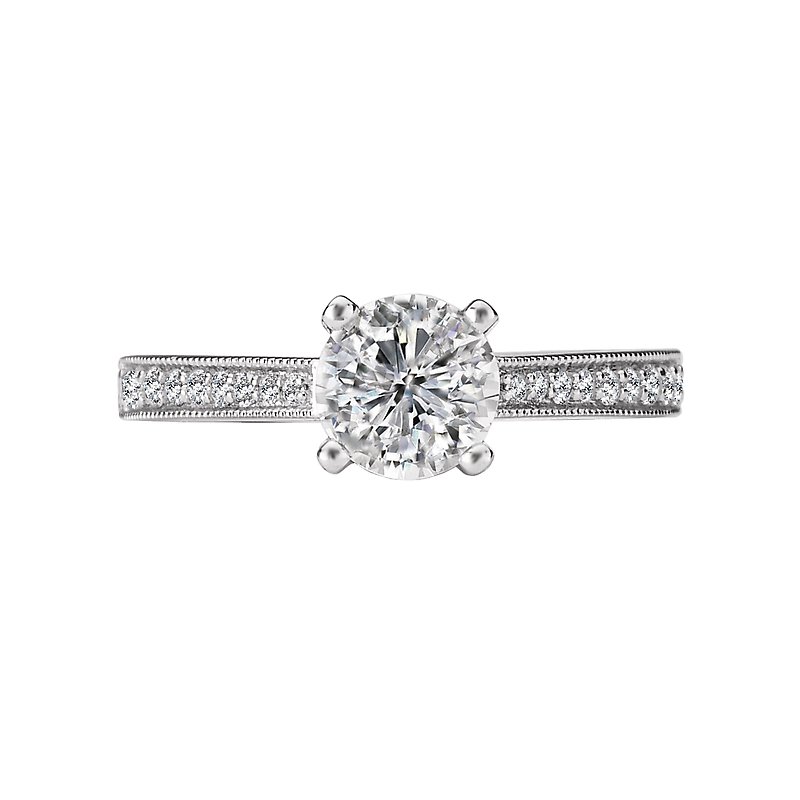 Classic Diamond Ring Created in 14k White Gold Features Tapered Round Diamonds Surrounded by Milgrain Detail Running along the Shank. ( D 1/5 carat total weight) This ring is a SEMI-MOUNT and it comes with NO CENTER STONE as shown but it will accommodate a 6.5mm round center stone.