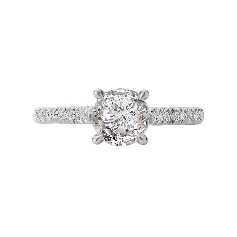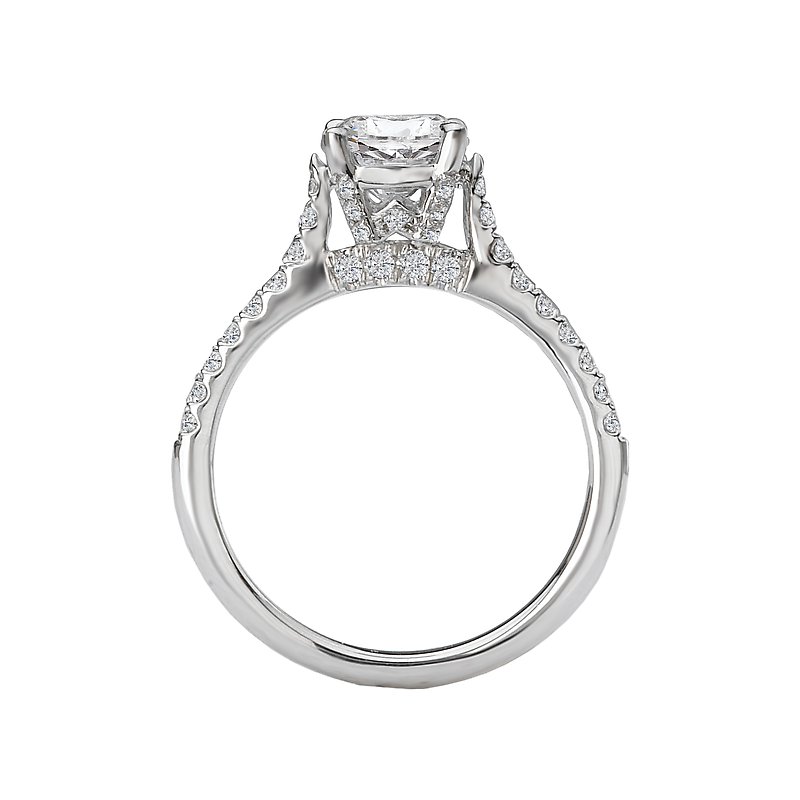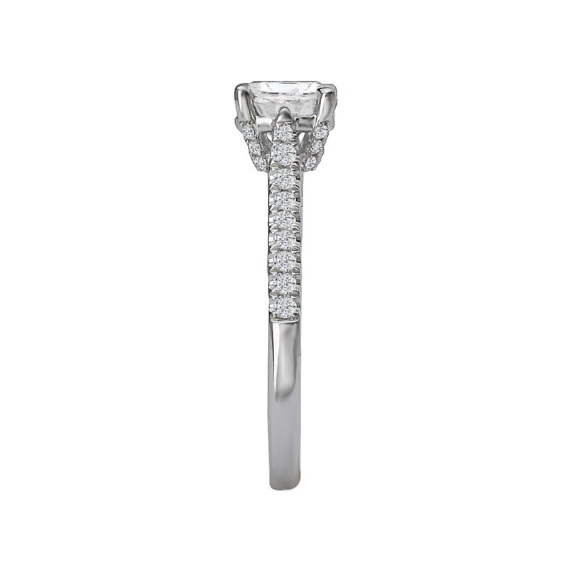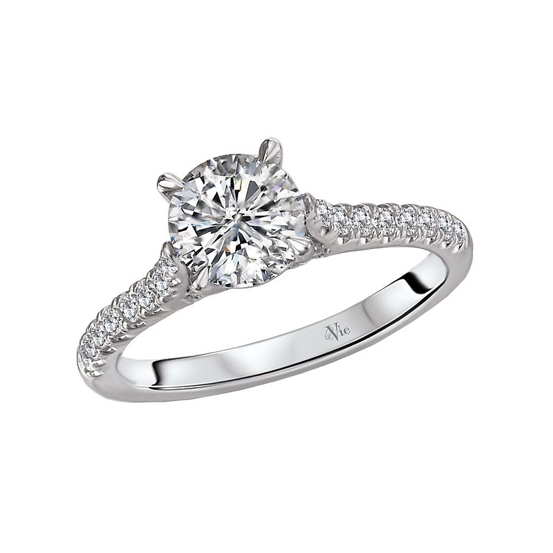 This Cathedral Style Ring Features a Sophisticated look of Round Sparkling Diamonds running along the Shank that are set in 14K White Gold. (D 1/3 carat total weight) This ring is a SEMI-MOUNT and it comes with NO CENTER STONE as shown but it will accommodate a 6.5mm round center stone.