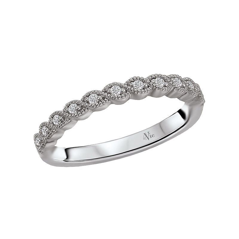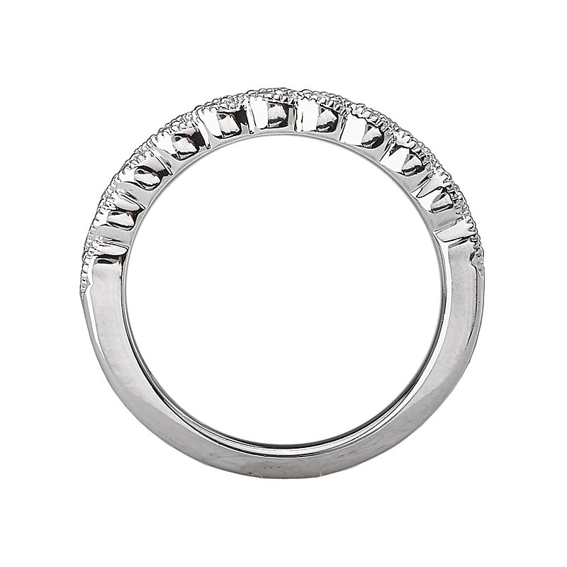 This is a matching faceted diamond wedding band with milgrain crafted in 14kt white gold. (D 1/10 carat total weight)