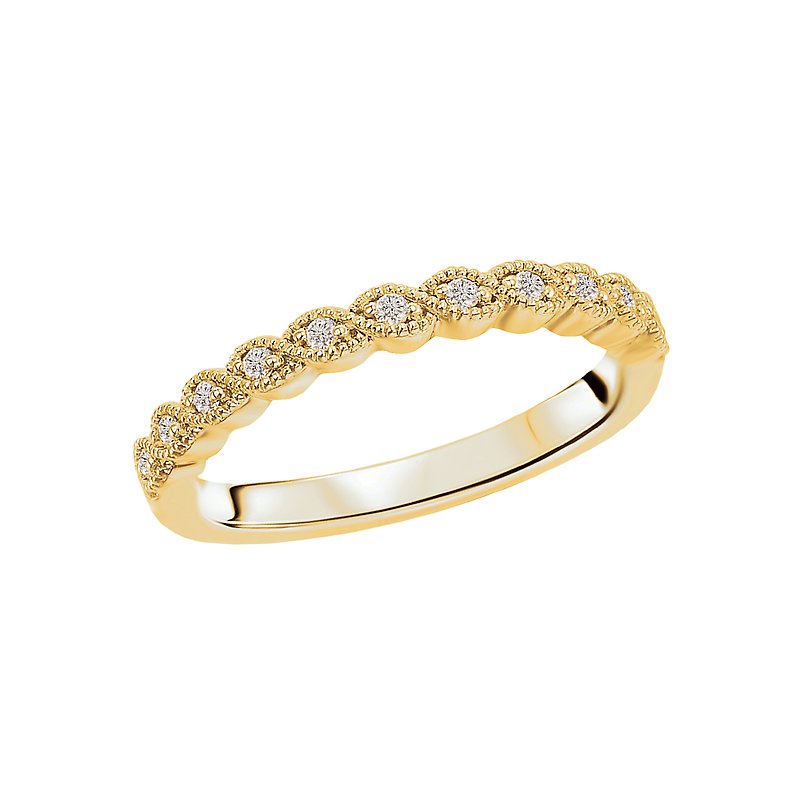 This wedding band features round faceted diamonds set in high polished 14kt yellow gold with milgrain detail. (D 1/10 carat total weight)