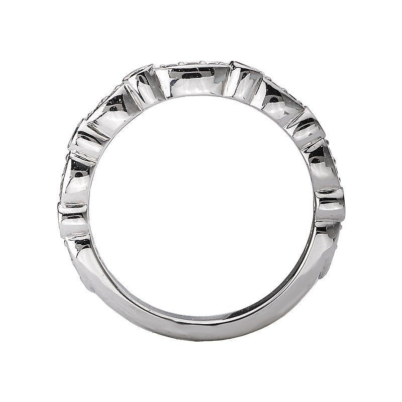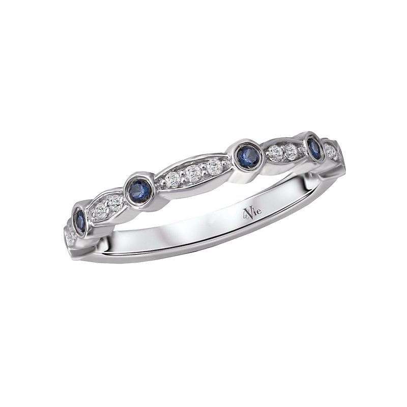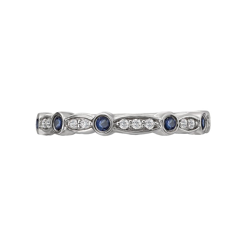 This scalloped matching wedding band features round faceted diamonds and sapphires set in 14k white gold. (D 1/8 carat weight and Sapp. 1/5 gem weight)