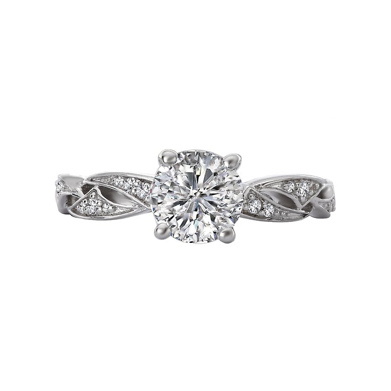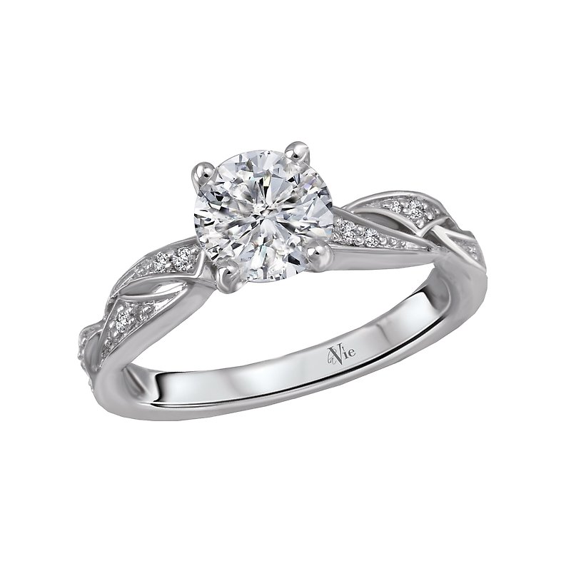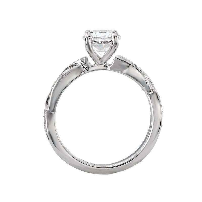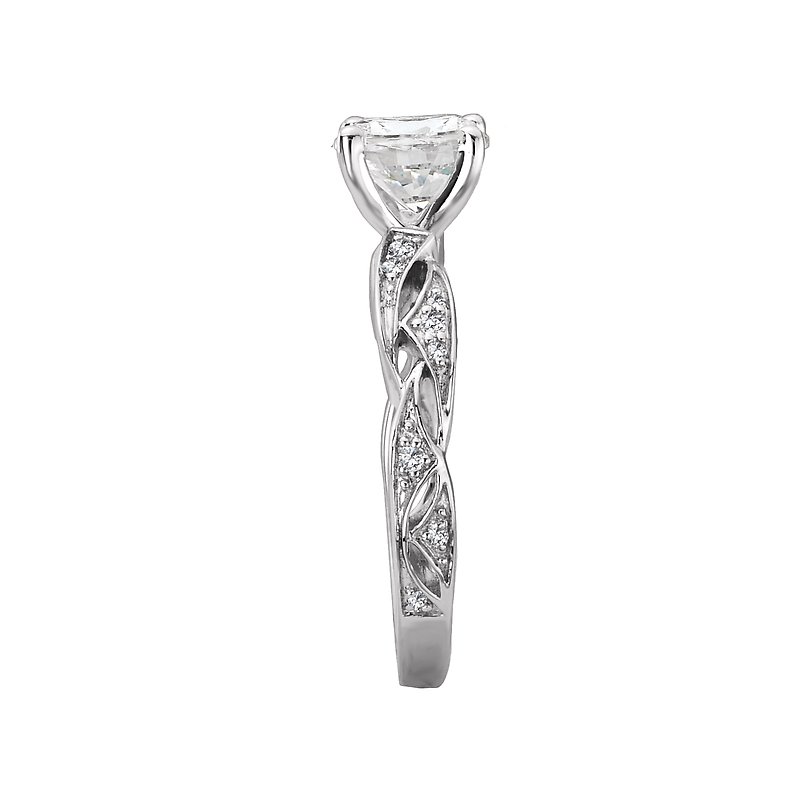 Engagement ring features a weaved shank lined with round sparkling diamonds set in 14K white gold. (D .06 carat total weight) This peg head SEMI-MOUNT comes with NO CENTER STONE as shown but it will accommodate a 6.5mm round center stone.