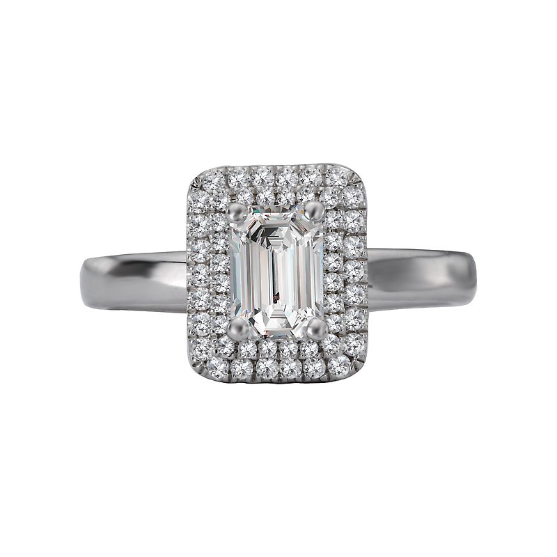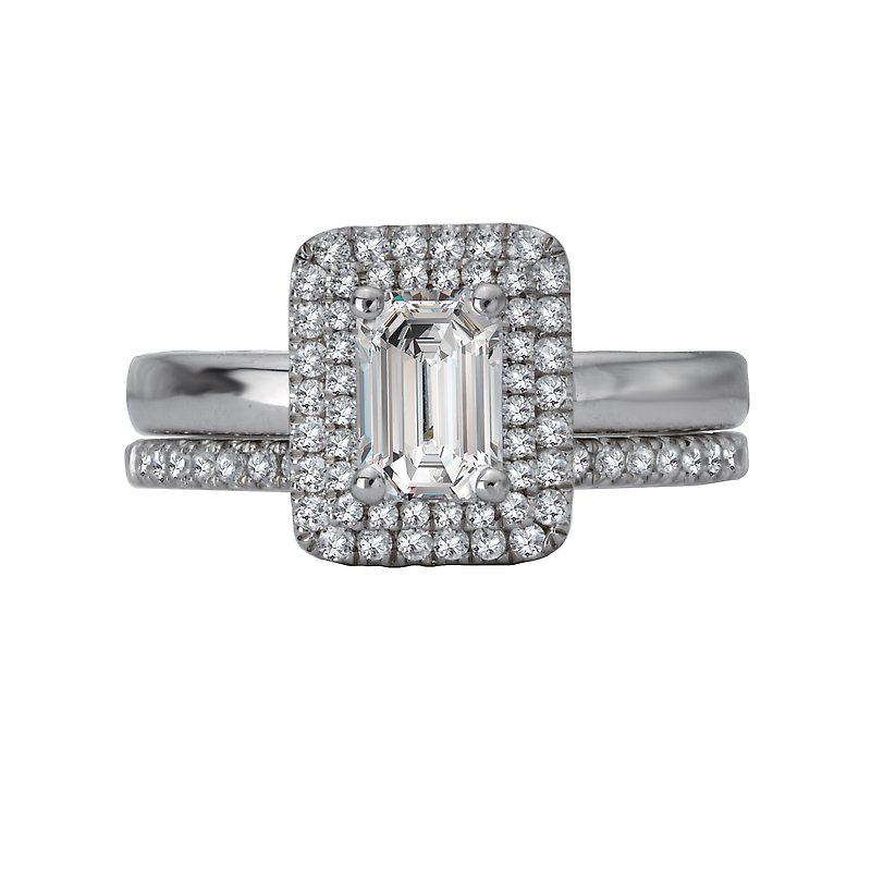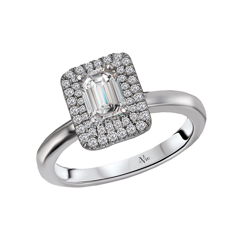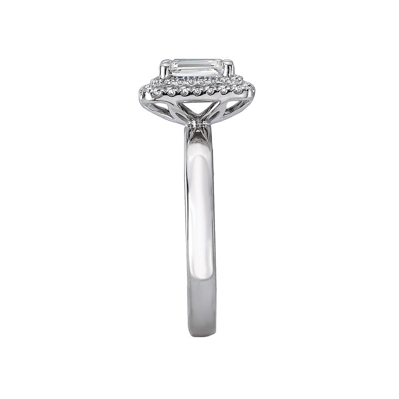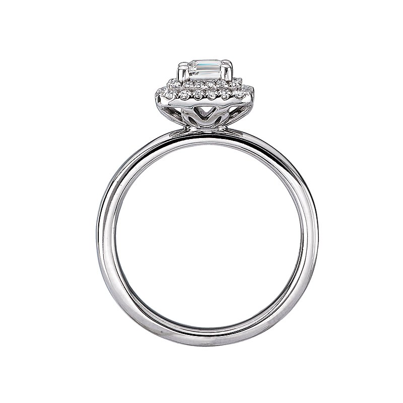 Beautiful bridal ring features an emerald shaped halo filled with round faceted diamonds set in high polished 14k white gold. (D 1/4 carat total weight) This ring is a SEMI-MOUNT and it comes with NO CENTER STONE as shown but it will accommodate a 6x4mm emerald cut center stone.
