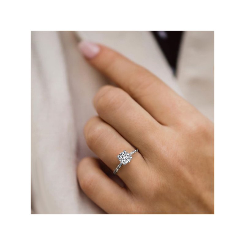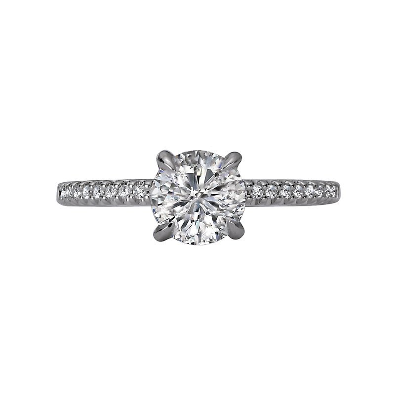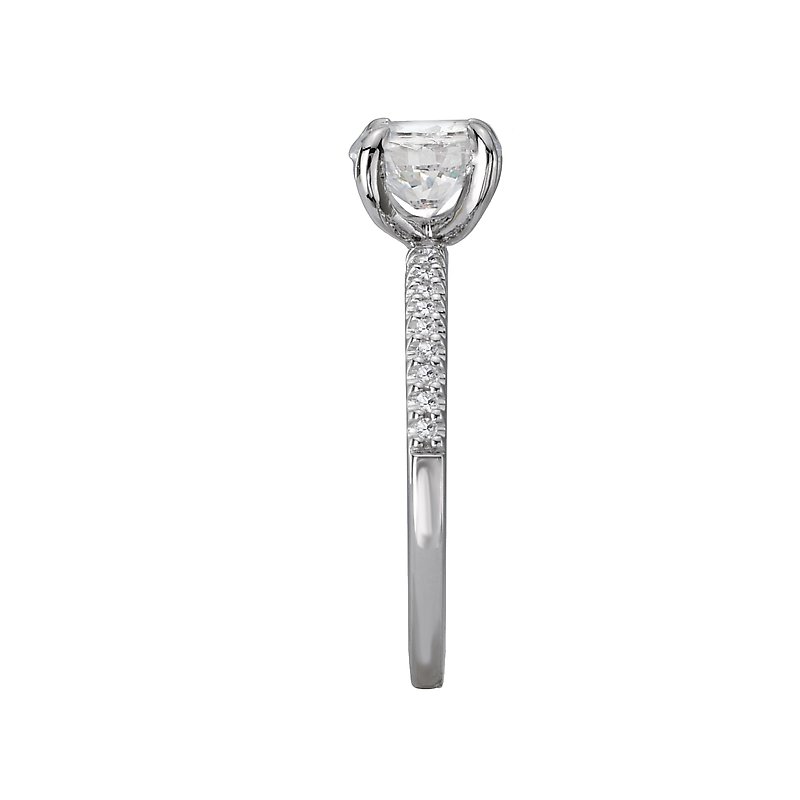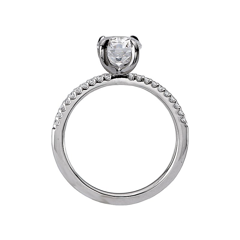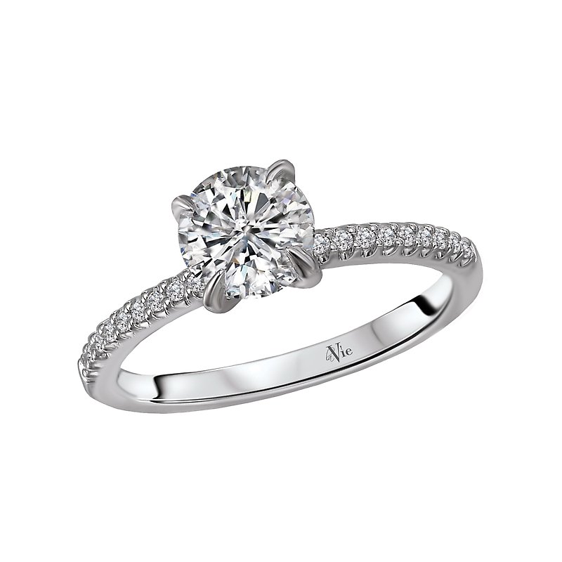 This elegant bridal ring showcases round sparkling diamonds set in high polished 14kt white gold. (D 1/10 carat total weight) This ring is a SEMI-MOUNT and it comes with NO CENTER STONE as shown but it will accommodate a 6.5mm round center stone.