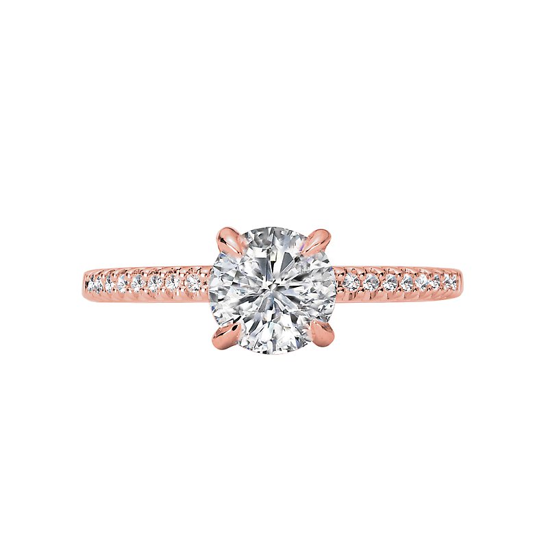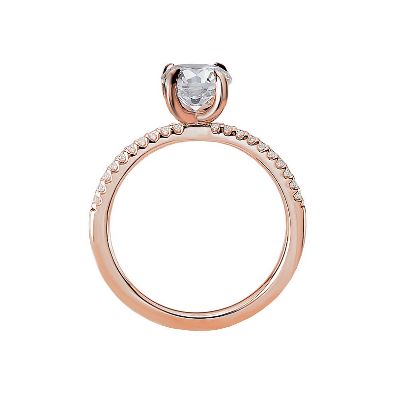 This elegant bridal ring showcases round sparkling diamonds set in high polished 14kt rose gold. (D 1/10 carat total weight) This ring is a SEMI-MOUNT and it comes with NO CENTER STONE as shown but it will accommodate a 6.5mm round center stone.