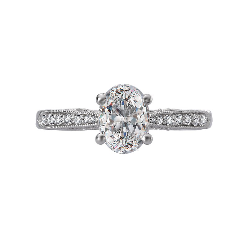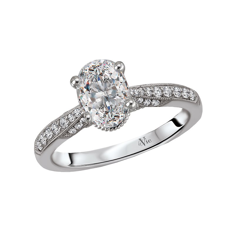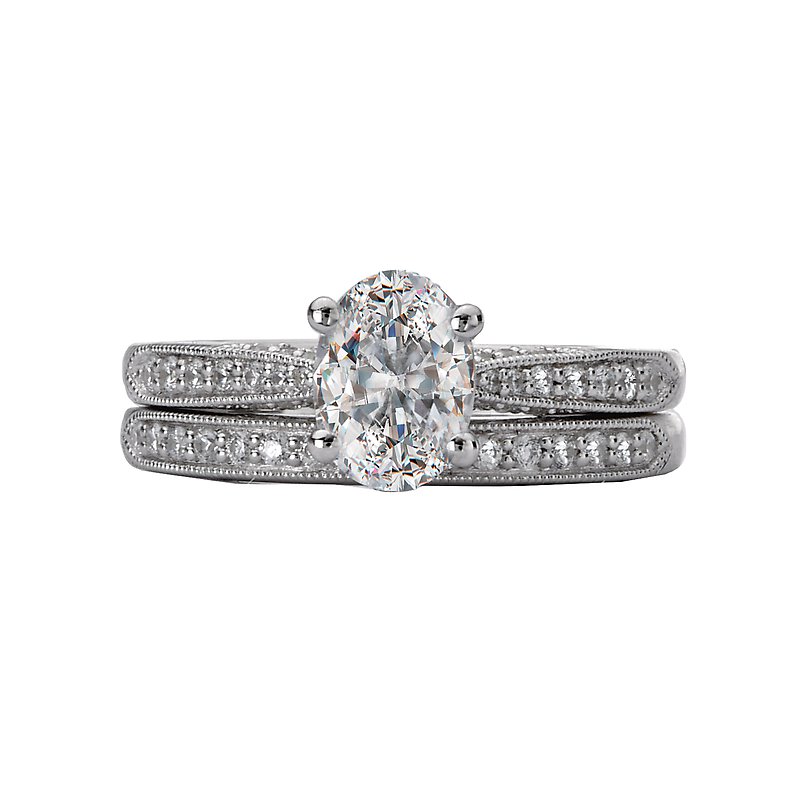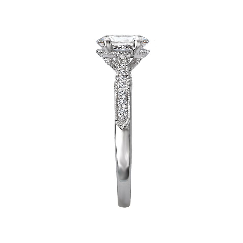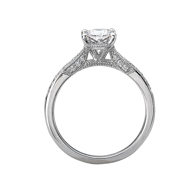 Bridal ring showcases tapered sparkling round diamonds set in high polished 14kt white gold accented with milgrain detail. (D 1/7 carat total weight) This ring is a SEMI-MOUNT and it comes with NO CENTER STONE as shown but it will accommodate a 7.5x5.5mm round center stone.